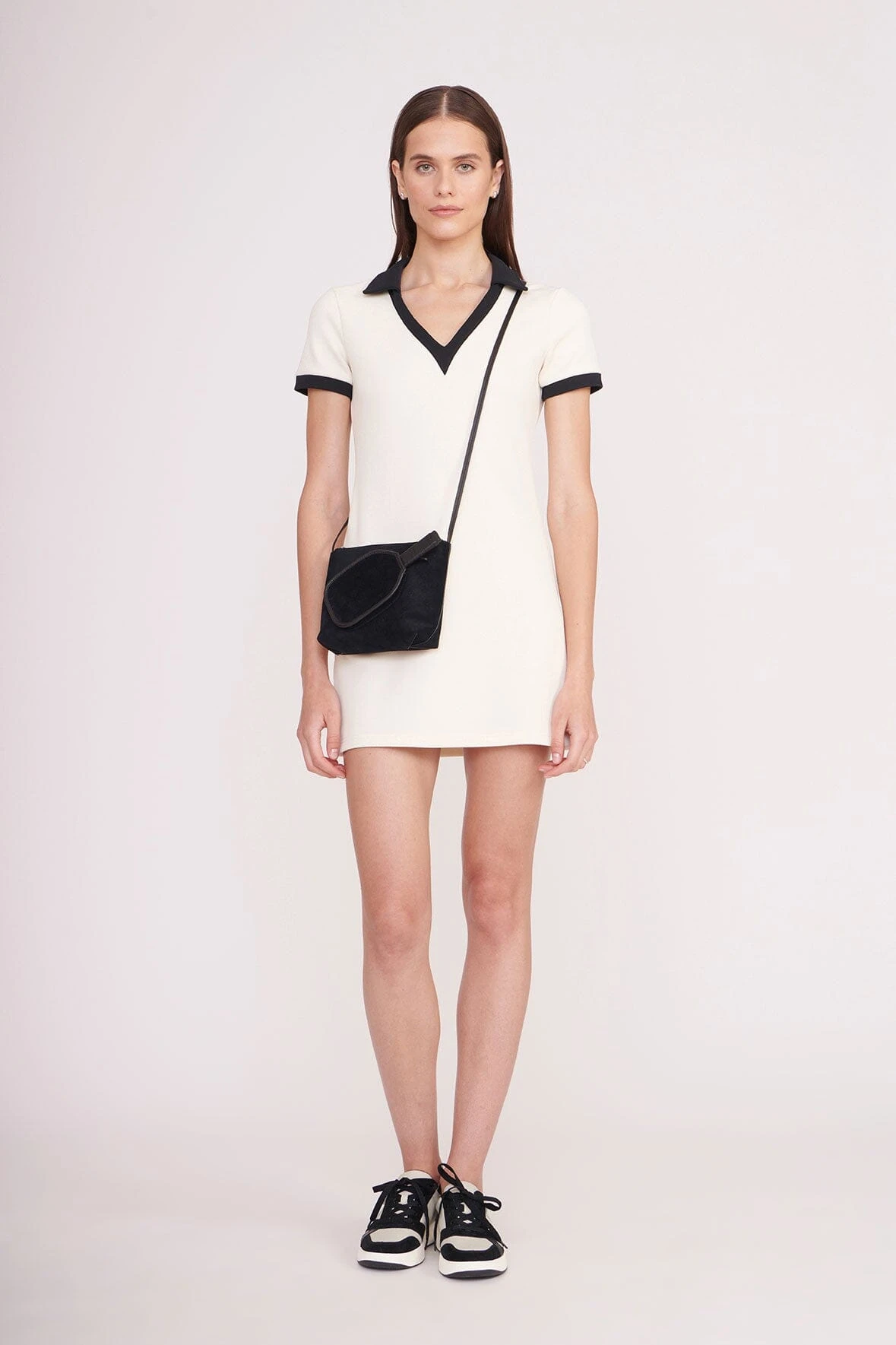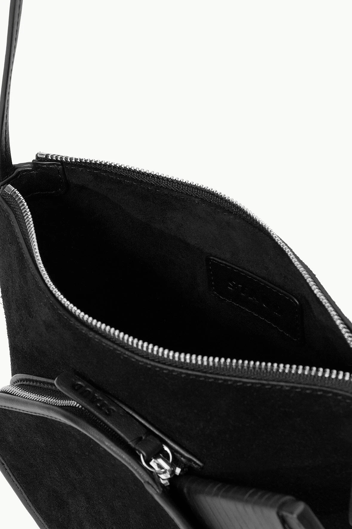 An adjustable suede crossbody with smooth leather trim, this style features an exterior pocket which holds a paddle-shaped handheld mirror.Â