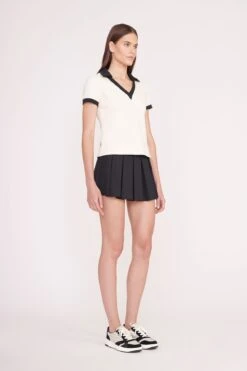 An adjustable crossbody bag with leather trim, this style features an exterior pocket which holds a paddle-shaped handheld mirror.
