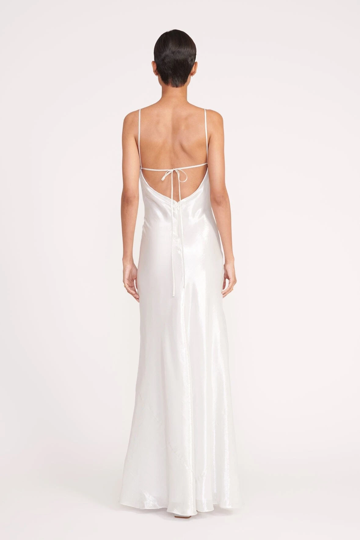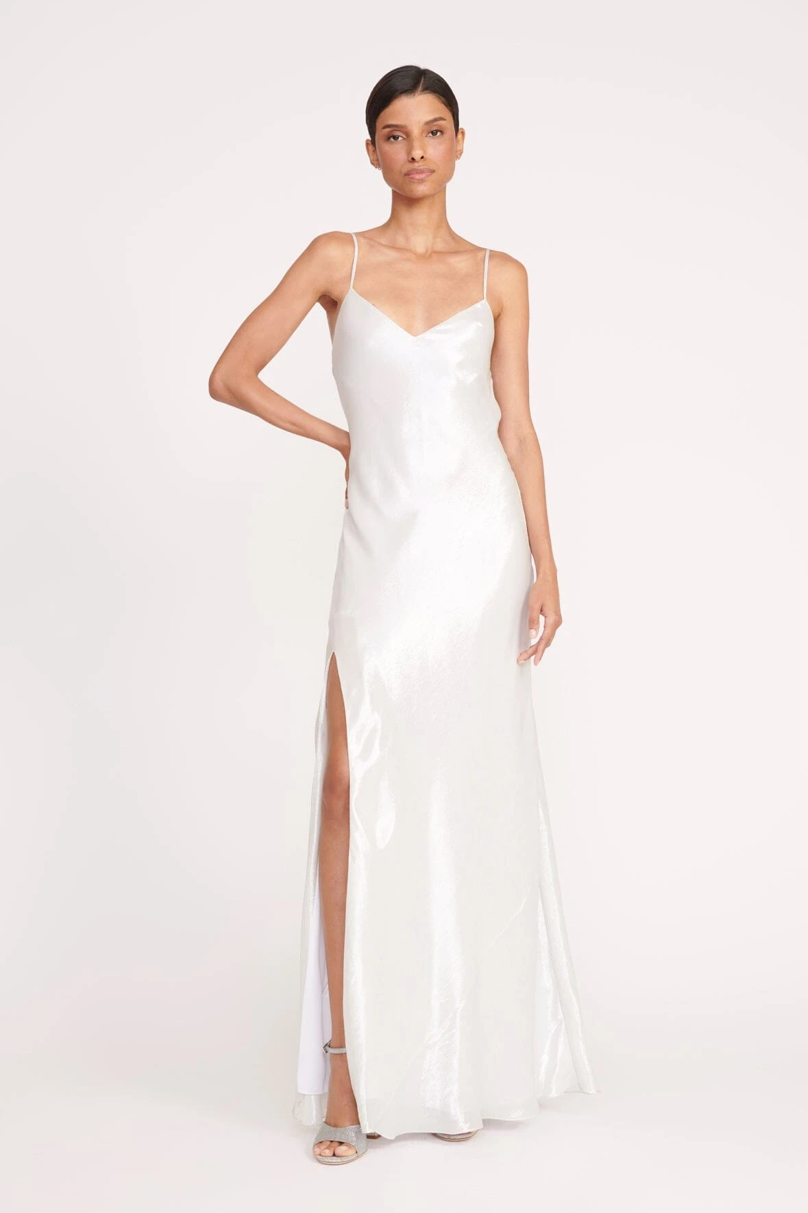 The Alexa Dress has been updated in this festive fabrication for the holiday season; a maxi slip dress crafted in shiny satin with a lamé finish. This style features an easy silhouette, v-neckline, thigh-high slit, and a back detail with ties.