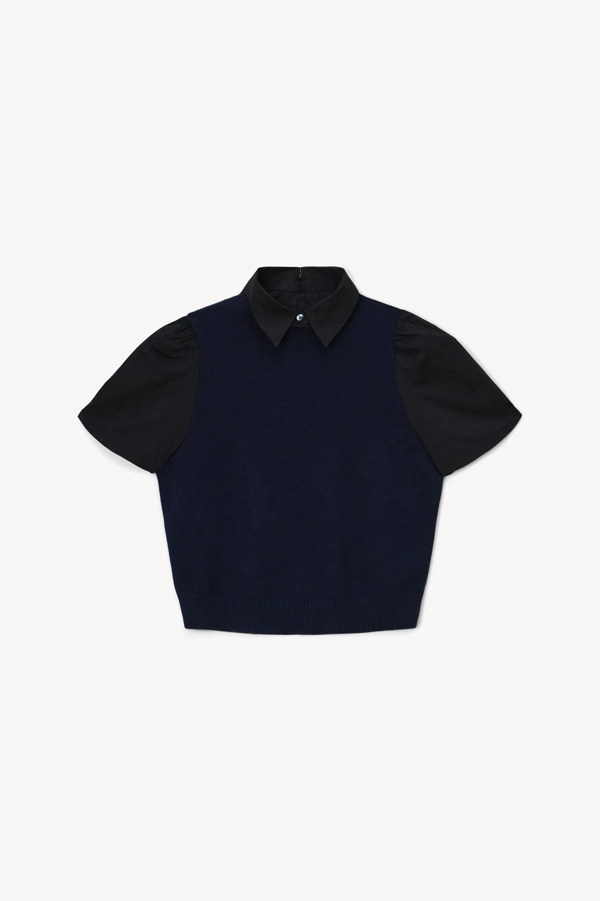 The Arya Top is a fine knit top with a short woven sleeve and removable collar.