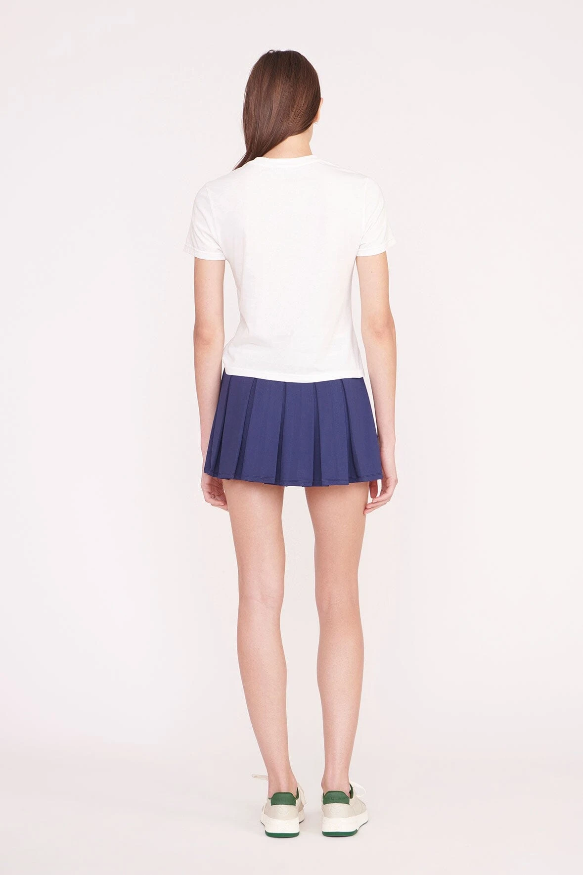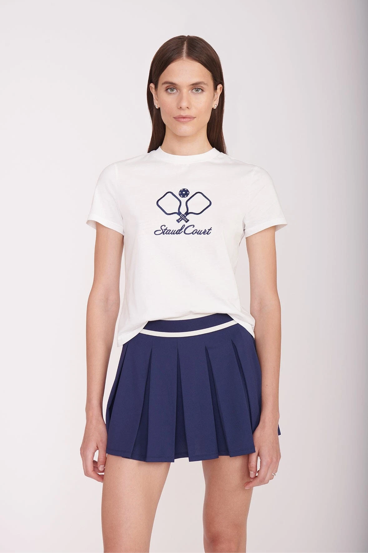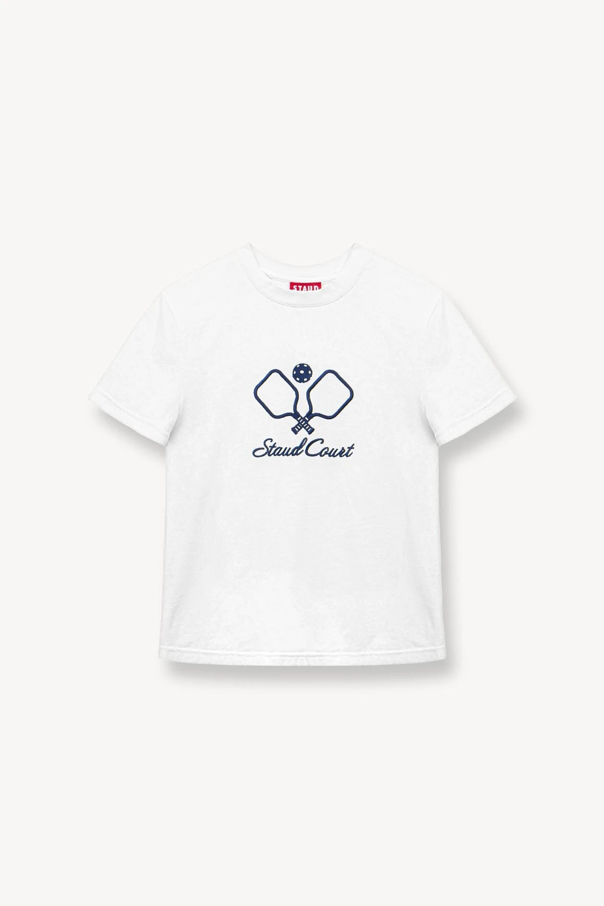 The Backhand Top is our perfect crewneck t-shirt with the Staud Court logo embroidered on the front.