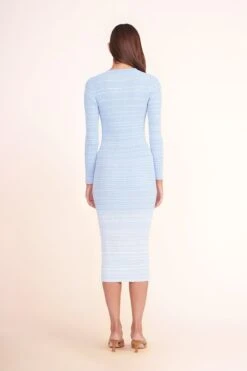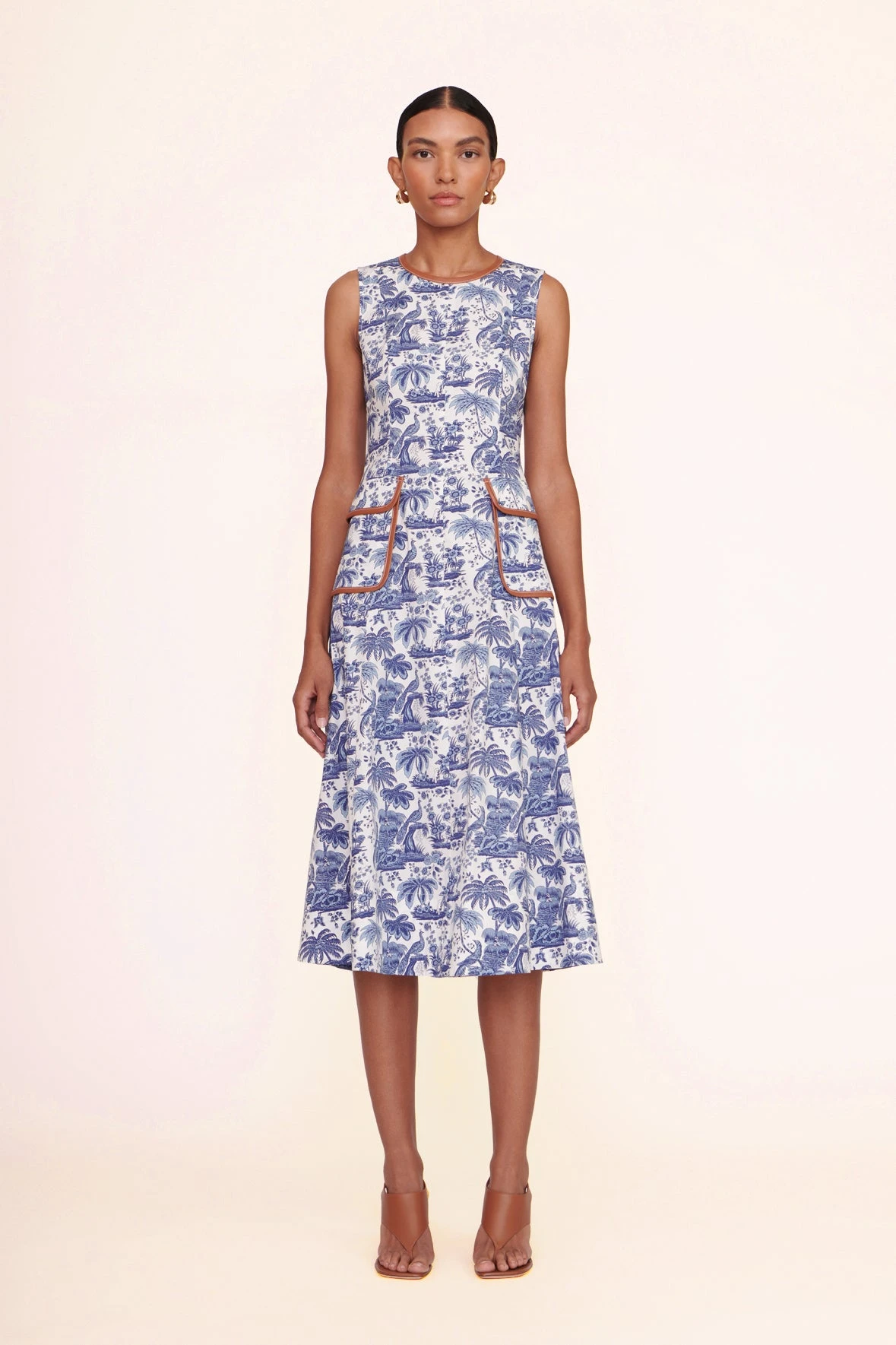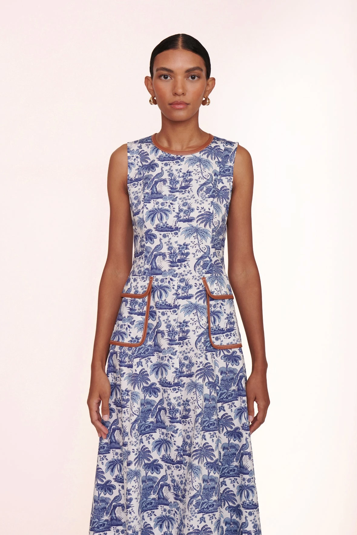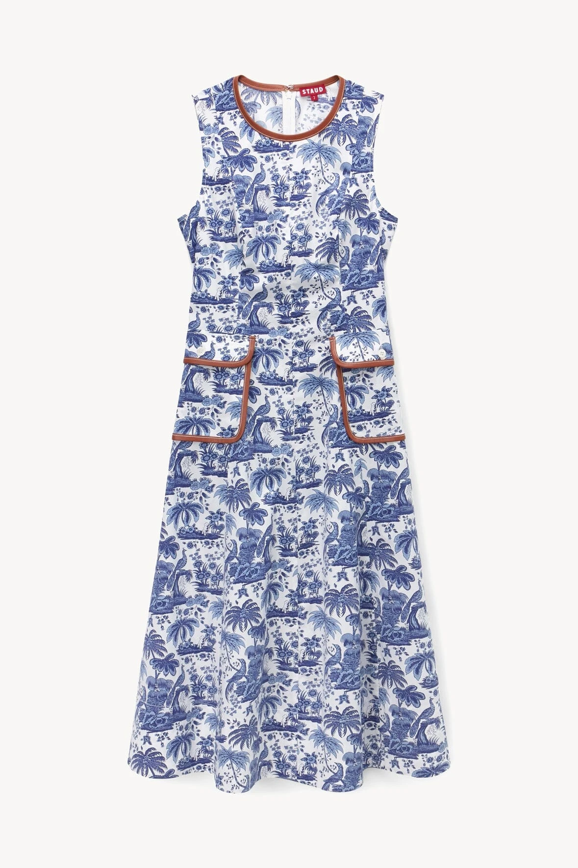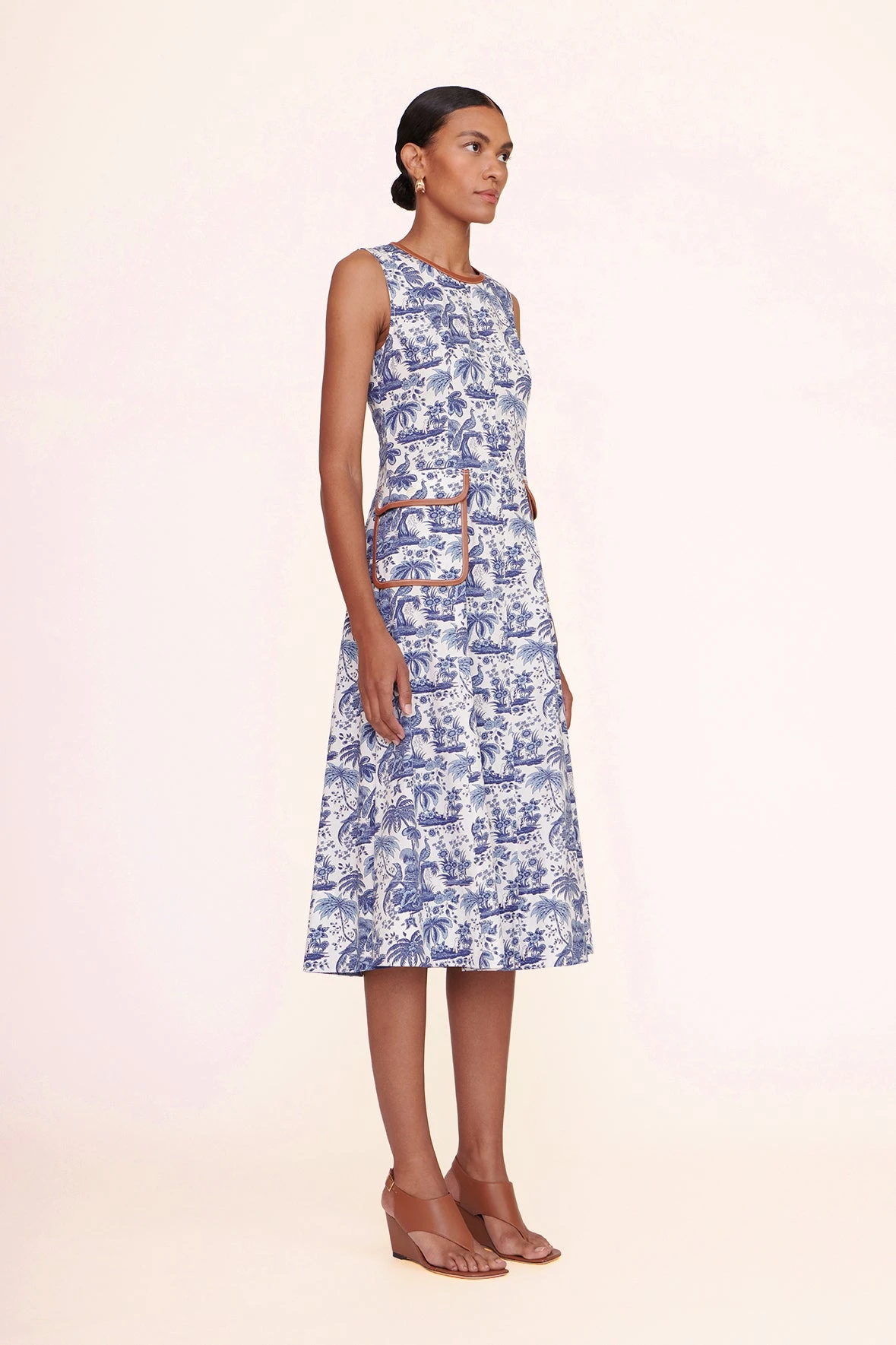 The Bait Dress is a midi-length toile poplin dress featuring two vegan leather trimmed front pockets. Sleeveless with a high neckline, fitted bodice, and flared skirt; this is a great transitional piece for day-to-night.