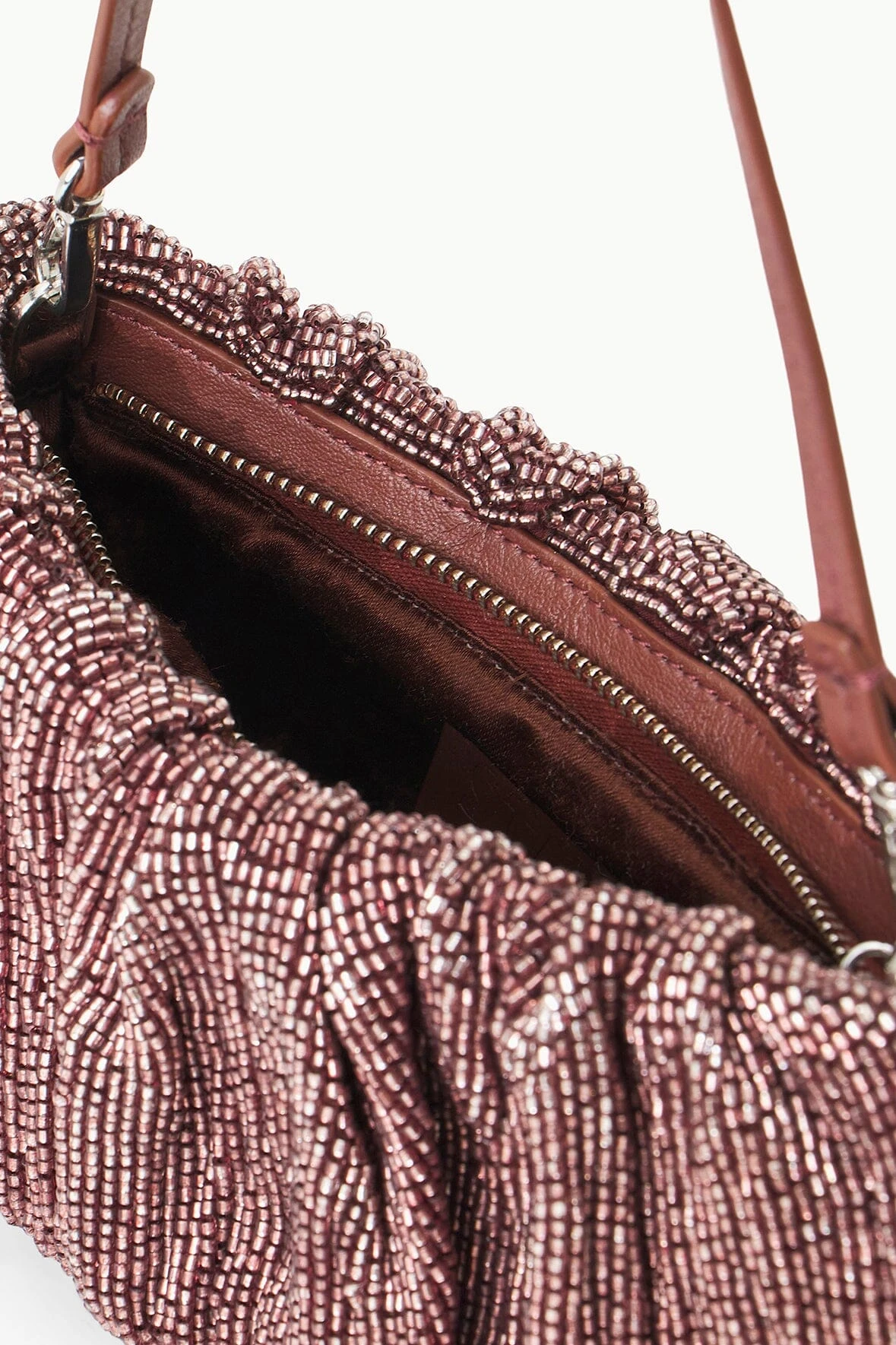 A hand-beaded update to our signature ruched bag. The Beaded Bean is a convertible bag that can be worn as a shoulder bag, wristlet or clutch.