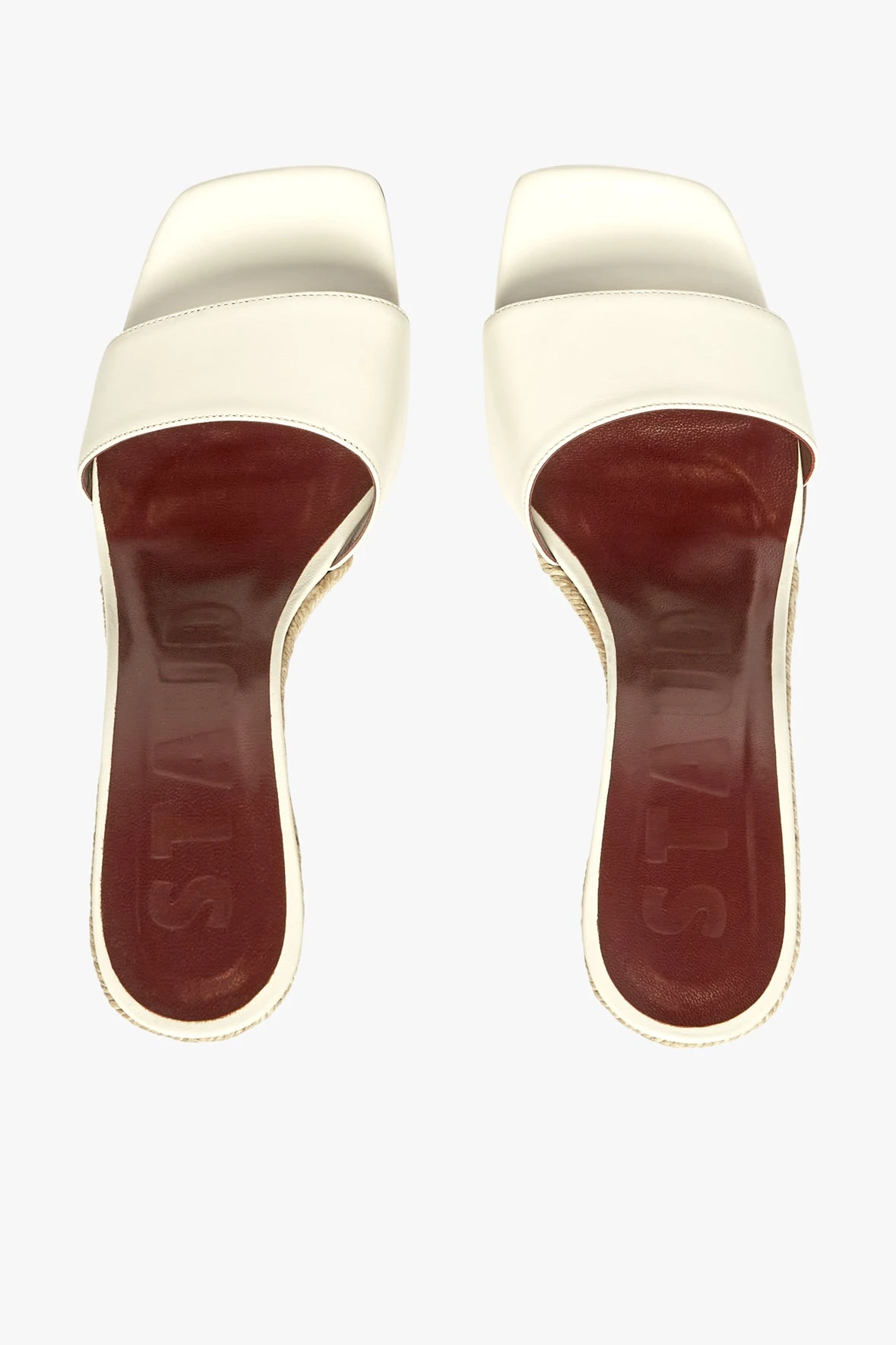 A leather sandal with espadrille wrapped wedge, the Billie features a single leather strap and square toe.