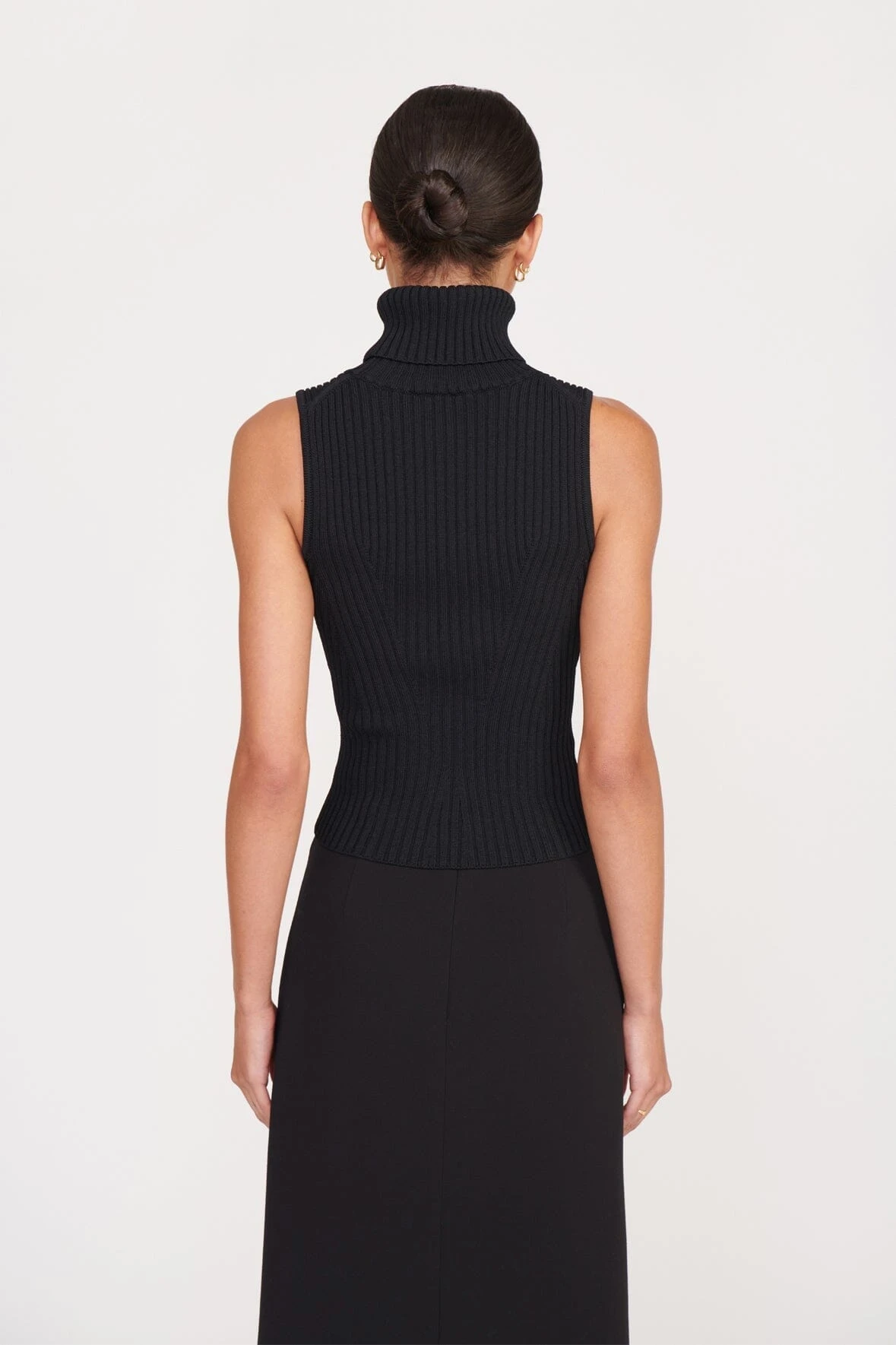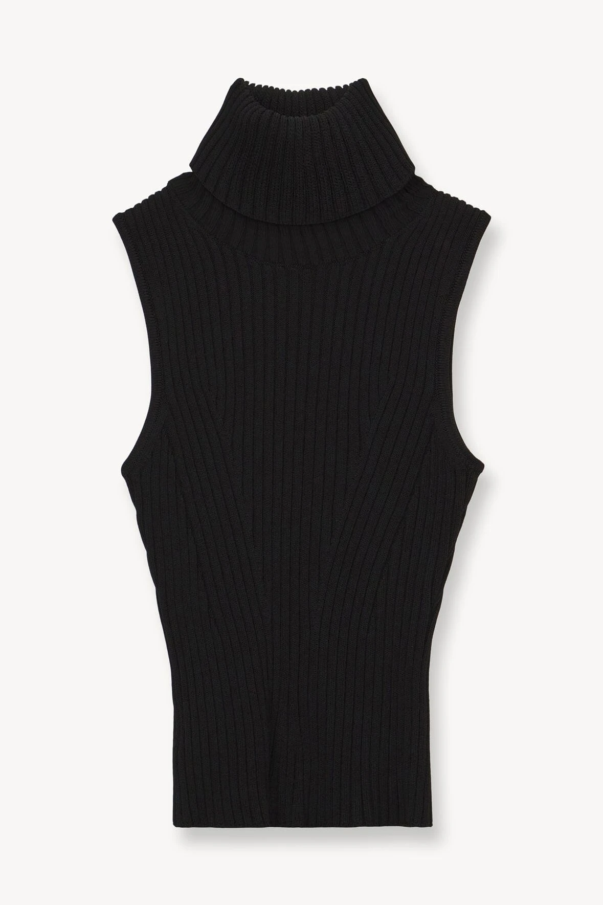 A sleeveless turtleneck top made out of a stretchy rib knit fabric. This style offers a fitted silhouette and full fashioning pattern throughout.Â
