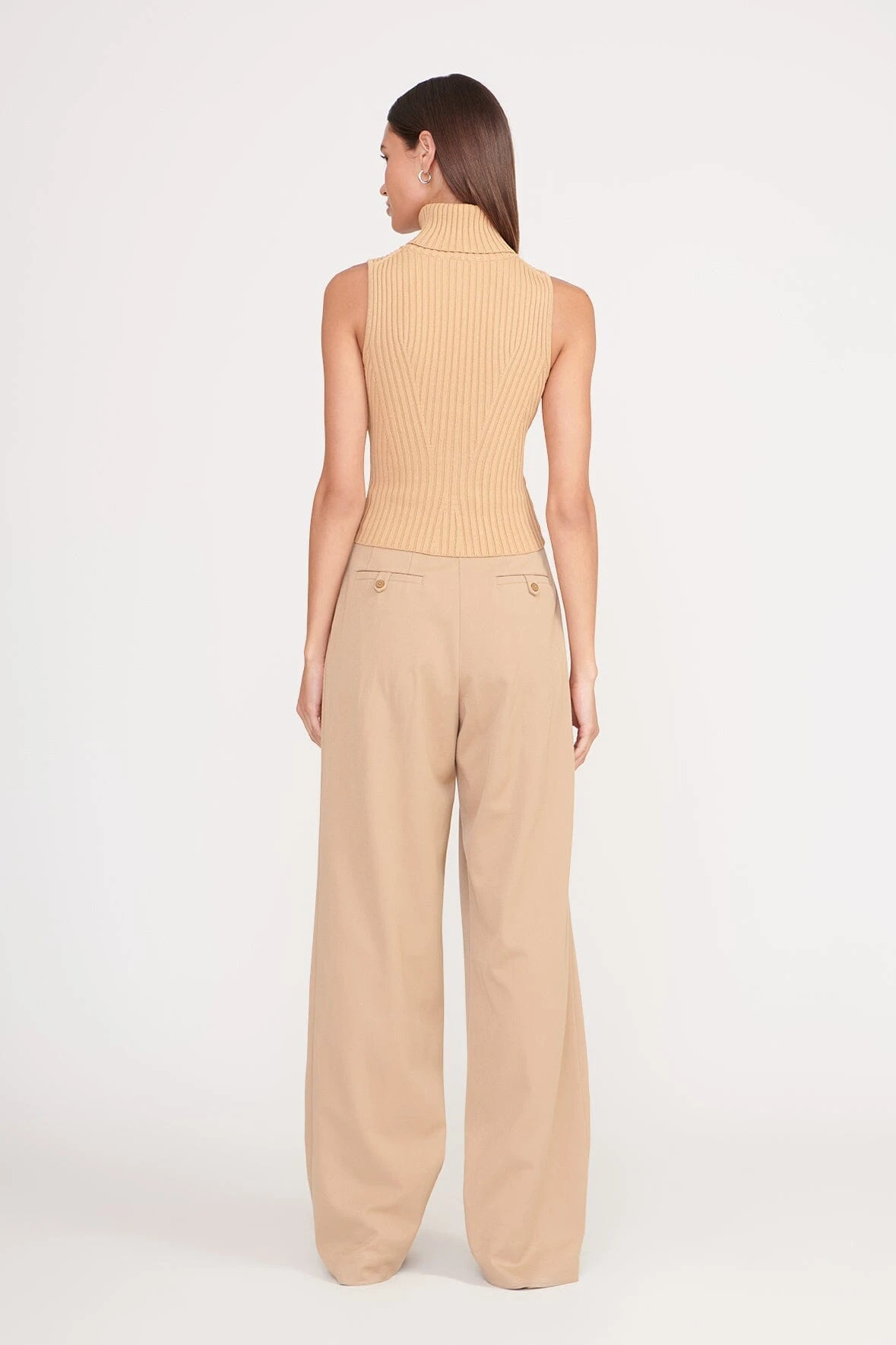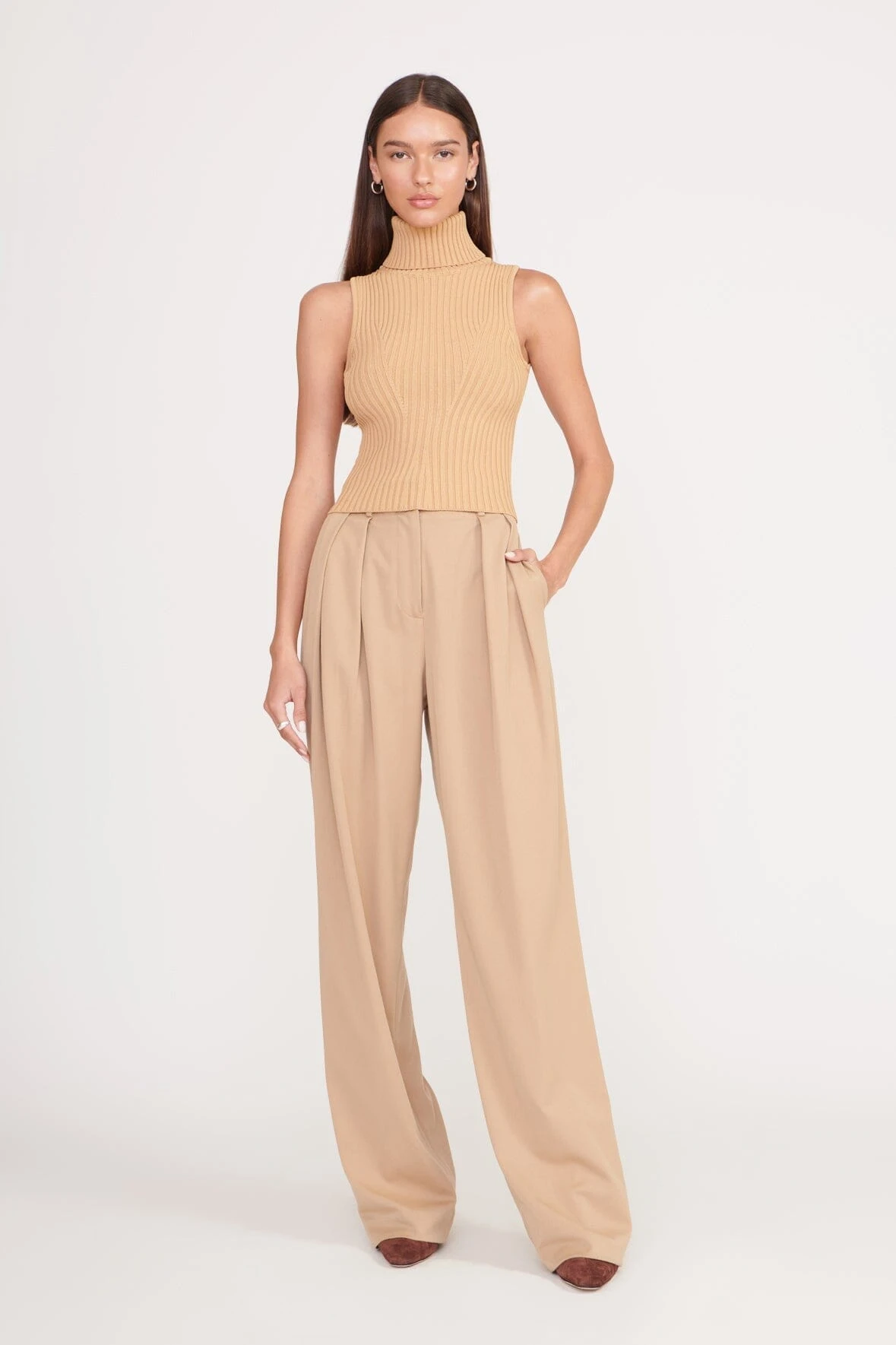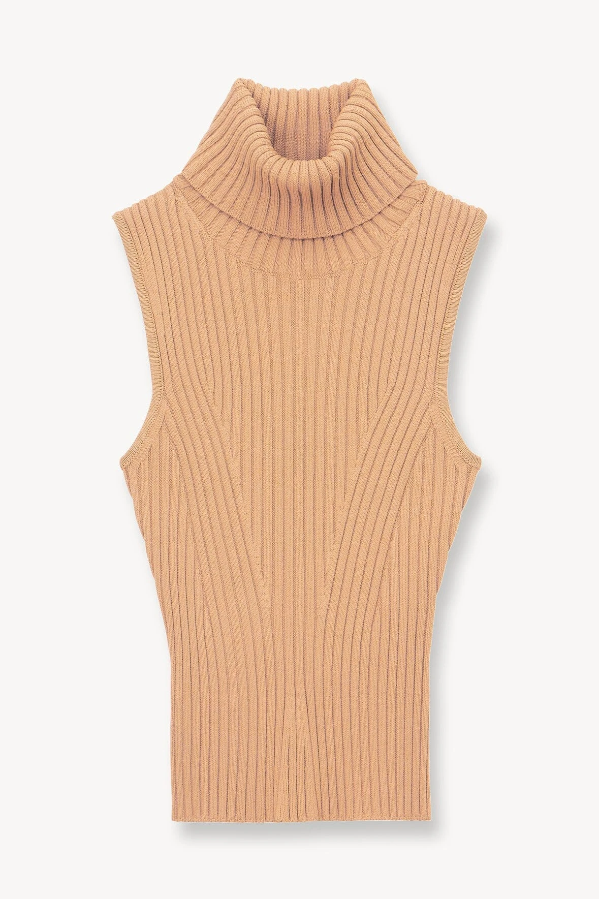 A sleeveless turtleneck top made out of a stretchy rib knit fabric. This style offers a fitted silhouette and full fashioning pattern throughout.Â