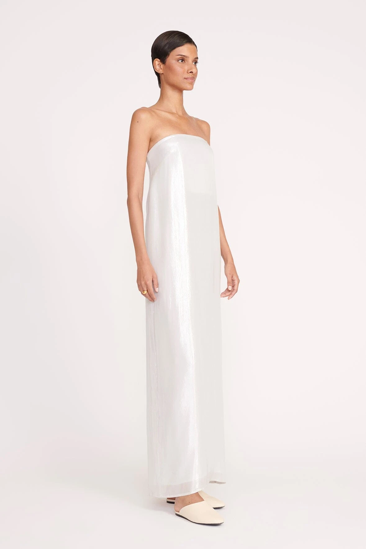 Our best-selling Casey Dress has been reimagined for the season; crafted in satin with a lamé finish, this strapless gown features a relaxed silhouette throughout the body, a back slit, and a hidden zipper.Â