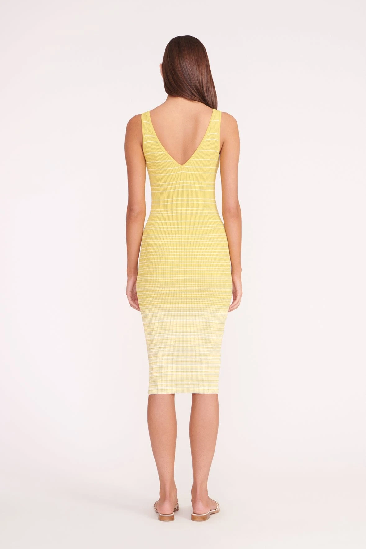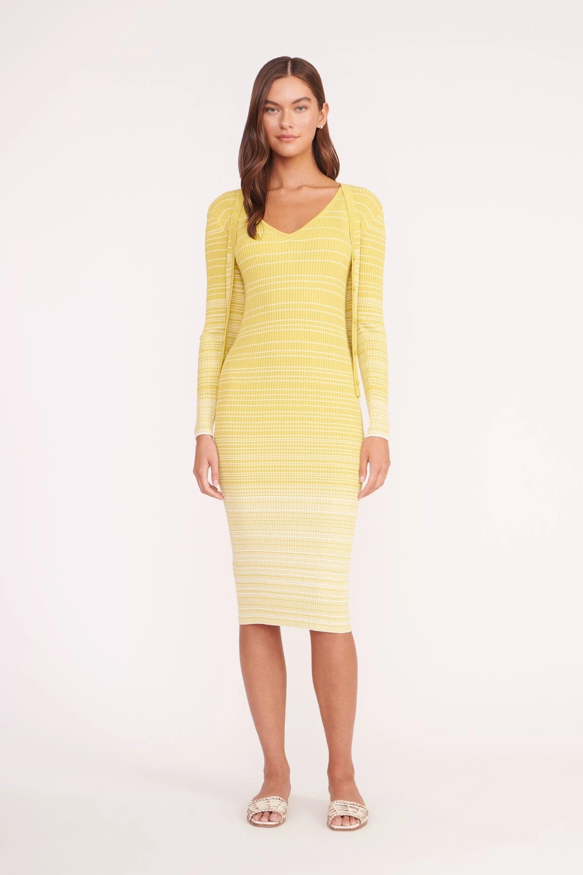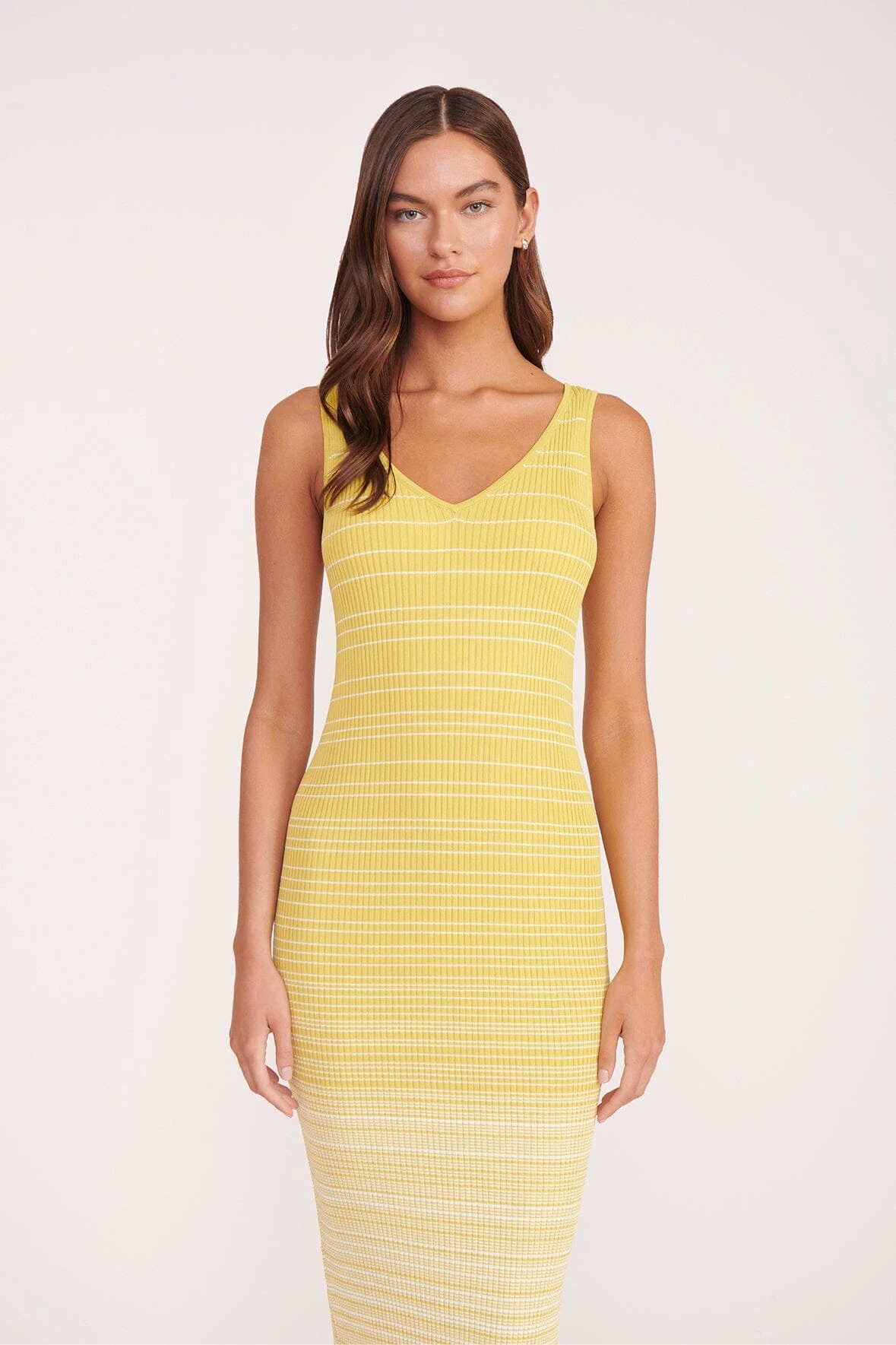 The Dana Dress in a new ombre stripe pattern. A sleeveless midi dress constructed out of our signature ribbed knit fabric, this style pairs perfectly with our Shoko & Cargo cardigans.