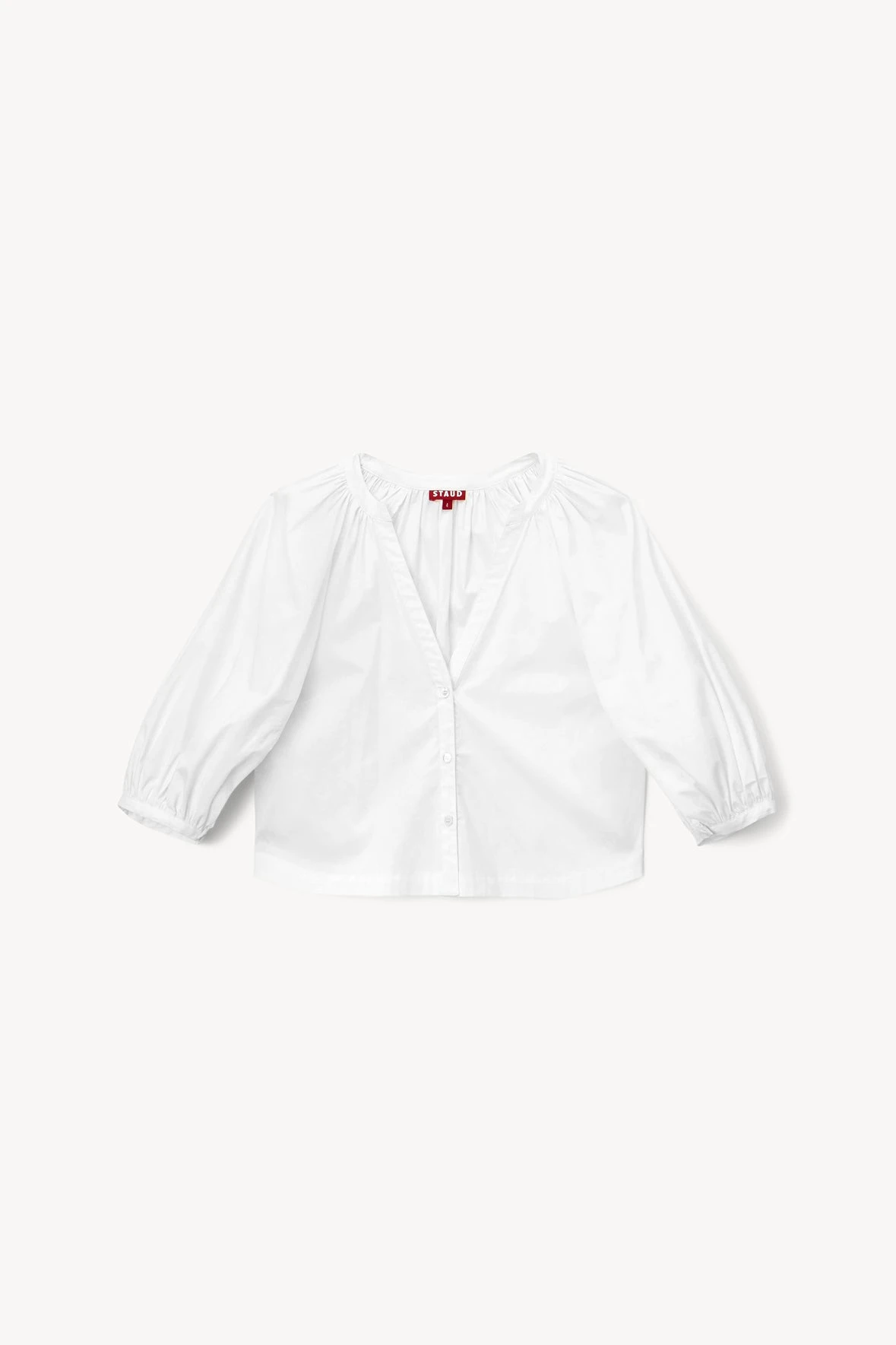 The Dill Top is a cotton poplin button-down with 3/4 puffed sleeves. This classic top can be worn year-round.Â