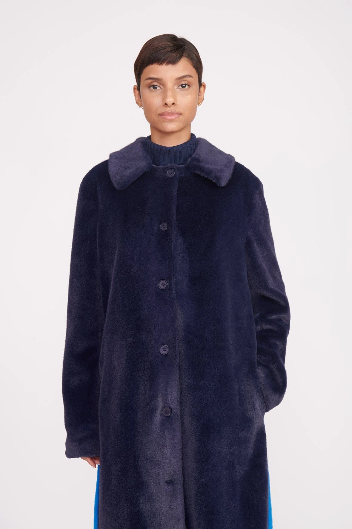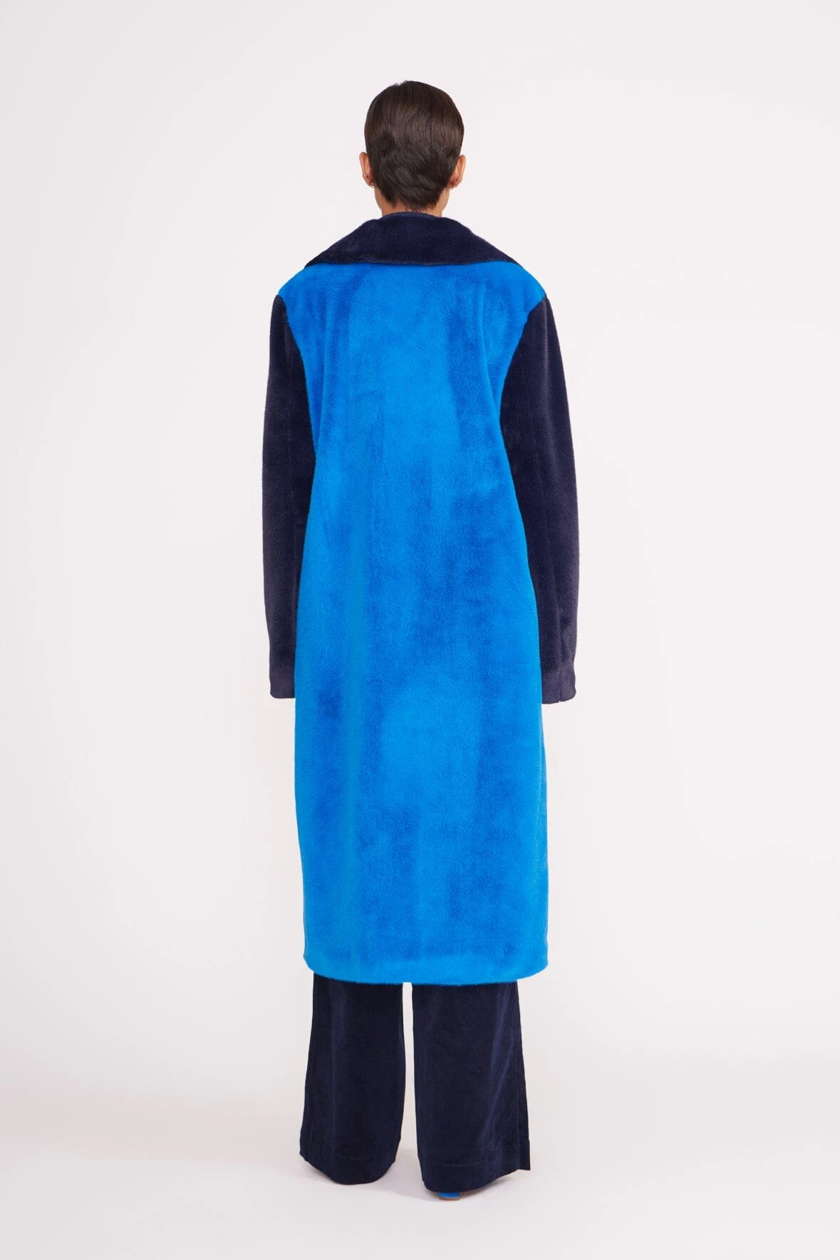 A collared longline coat in a faux-mink style. The Dubois features two side pockets and a contrasting color block panel in the back.