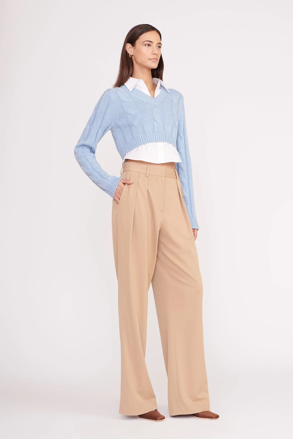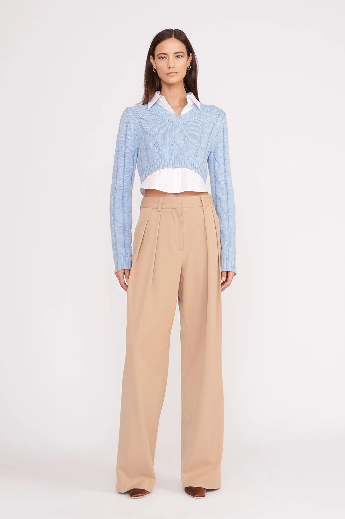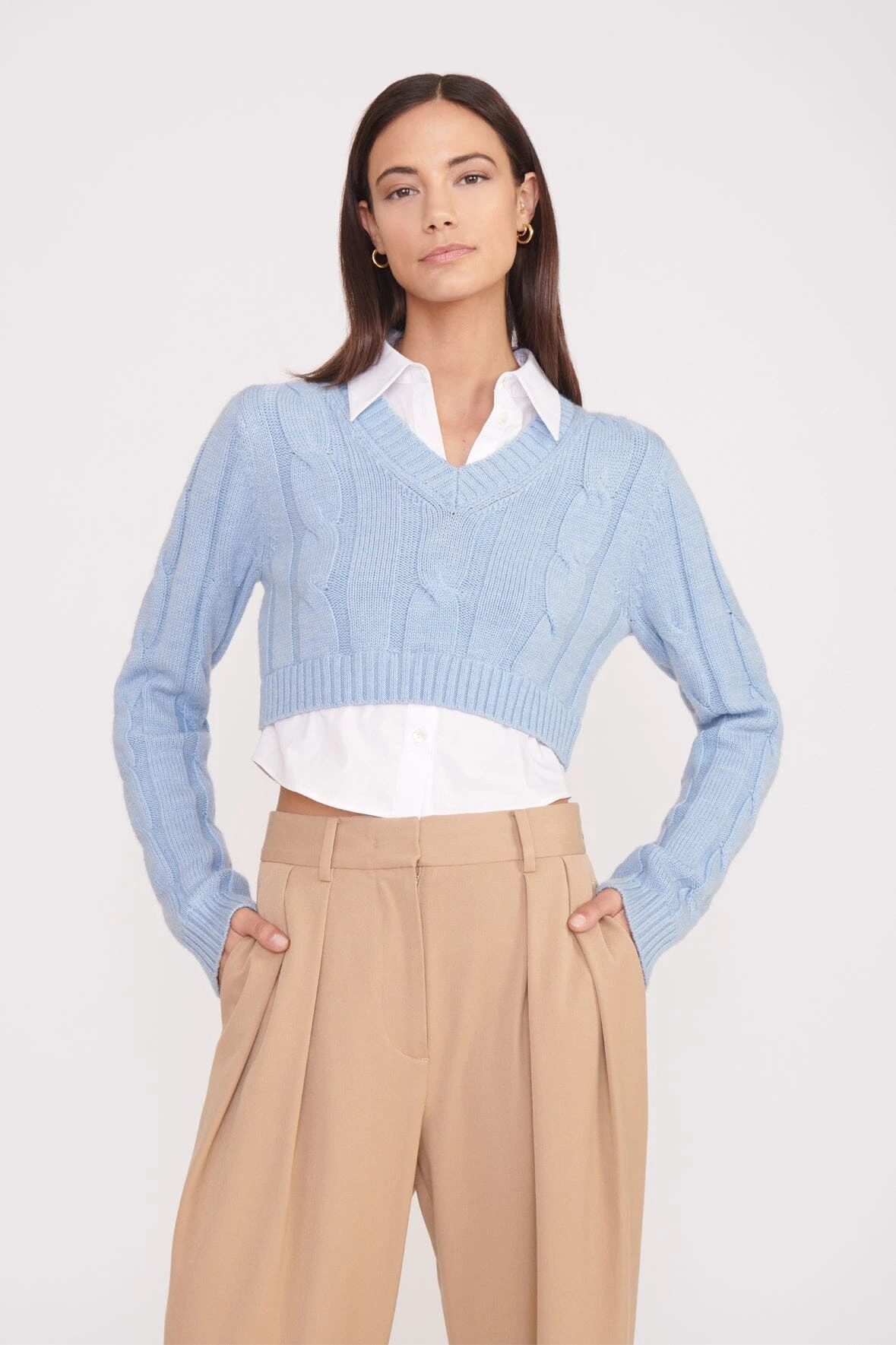 A layered poplin and knit long-sleeve top, the Duke Sweater features a cropped cable knit sweater over a cropped poplin button-up shirt for a layered look with one-piece ease.Â