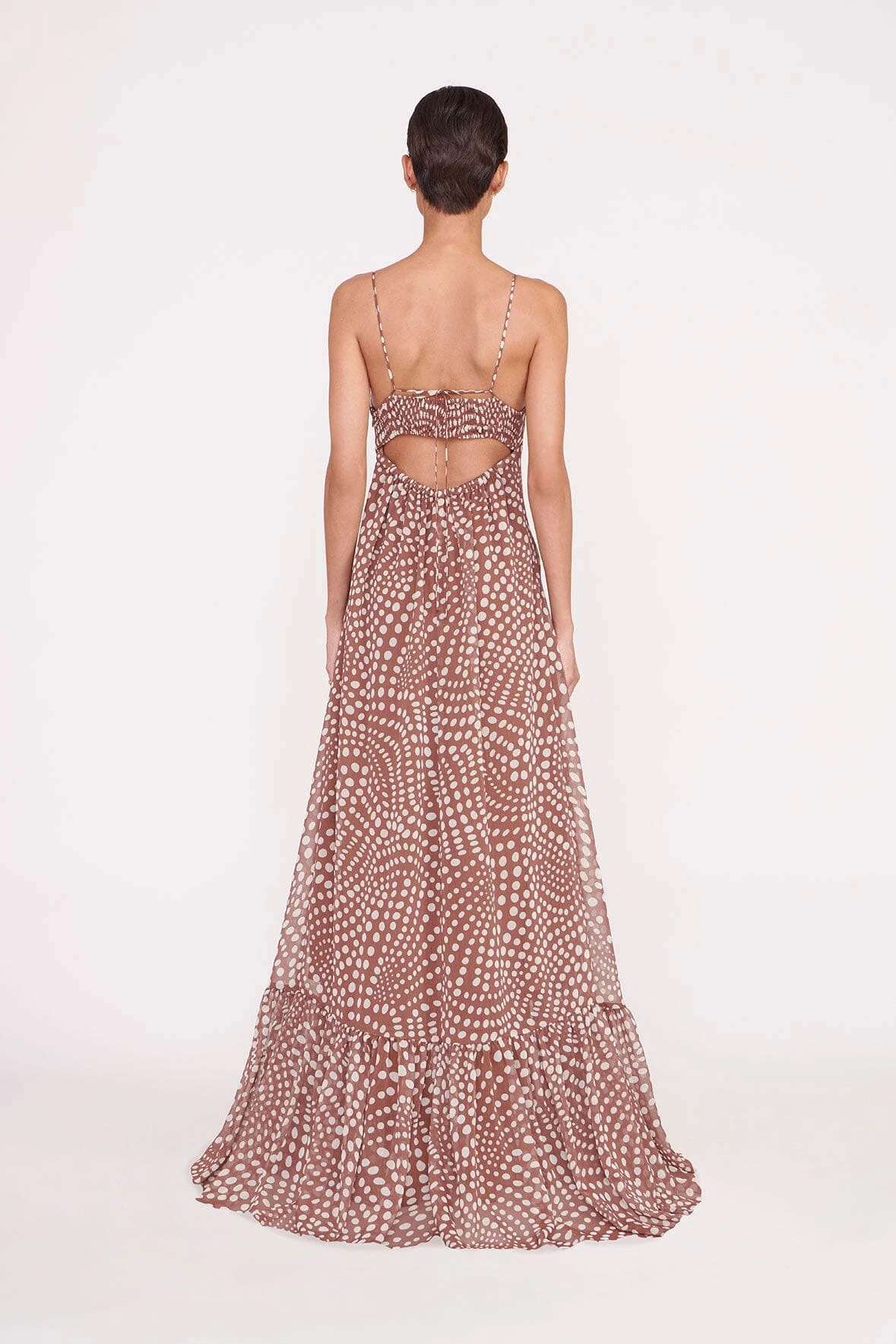 A full length gown constructed out of a printed crinkle chiffon fabric, the Florence Dress offers a fitted empire waistline and flowwy skirt. This style features a peplum hem and spaghetti straps which tie at the back.Â