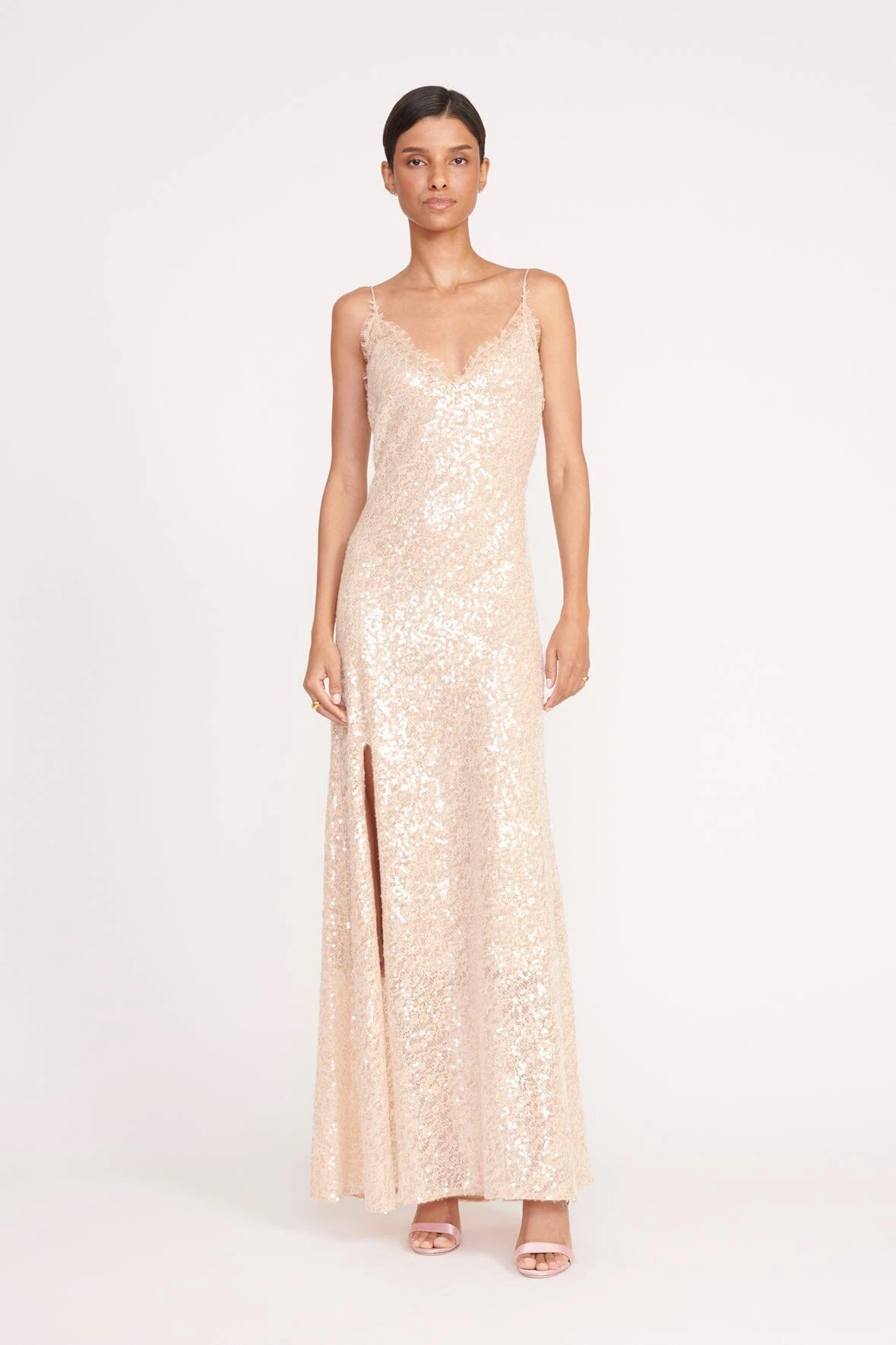 The Kezia Dress is a cocktail dress in a sexy lace fabric, but dressed up for the holidays with sequin embellishment. This style features a v-neckline and a thigh-high slit.