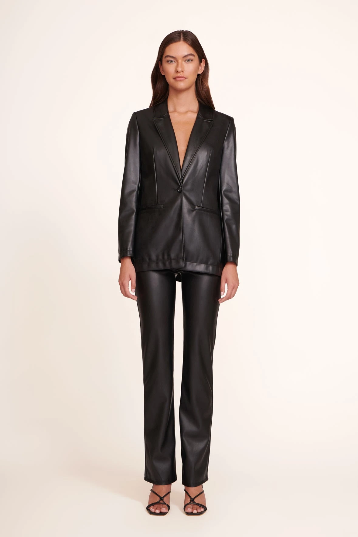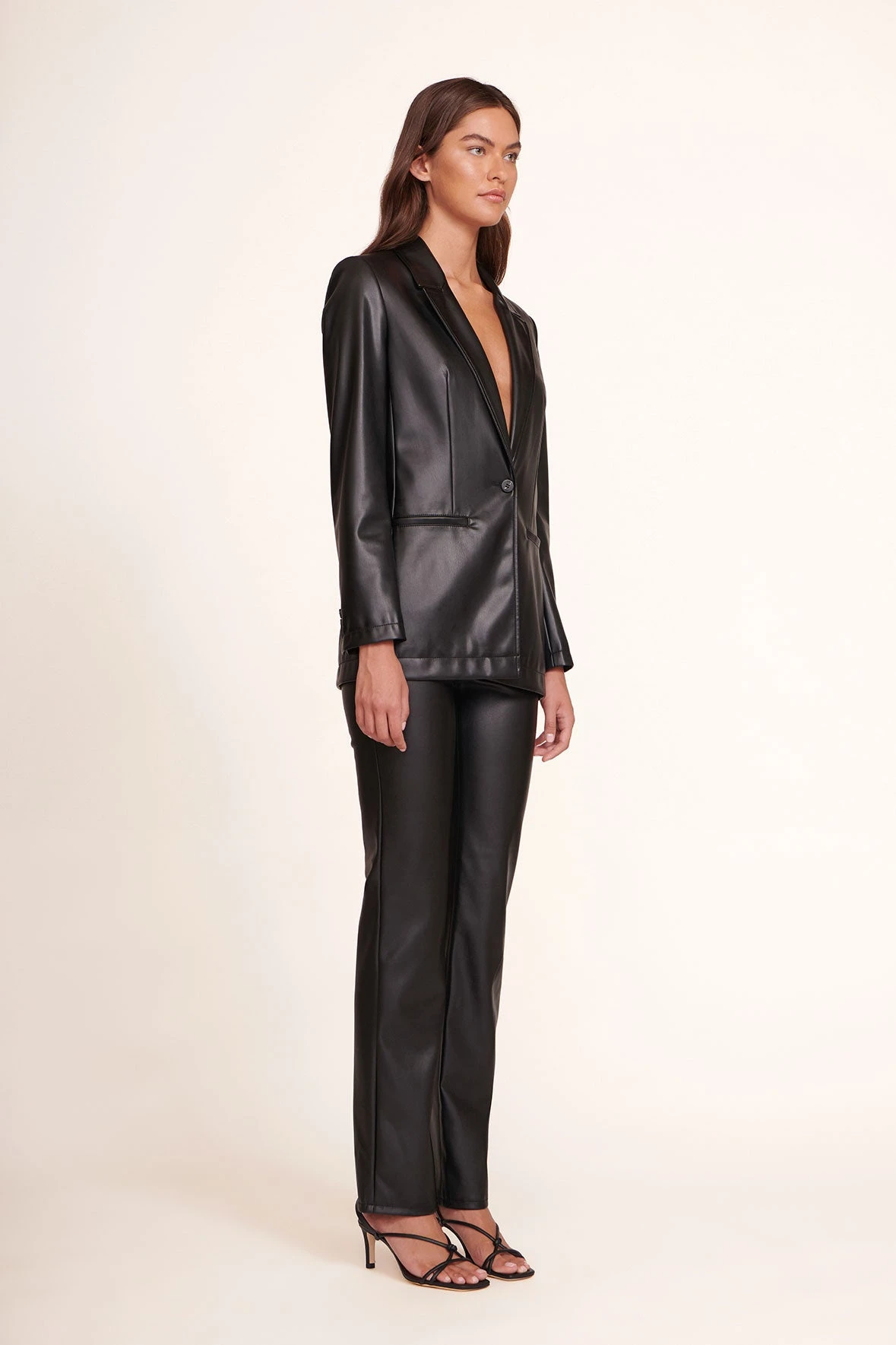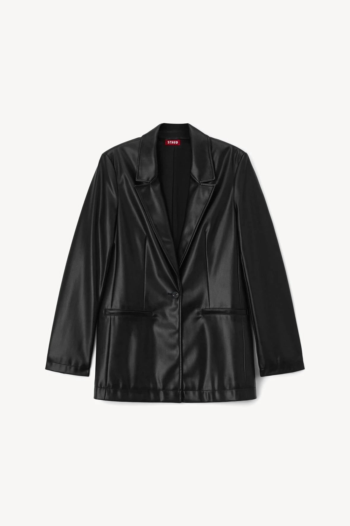 The Vegan Leather Madden Blazer features two front hip pockets with a single button closure.