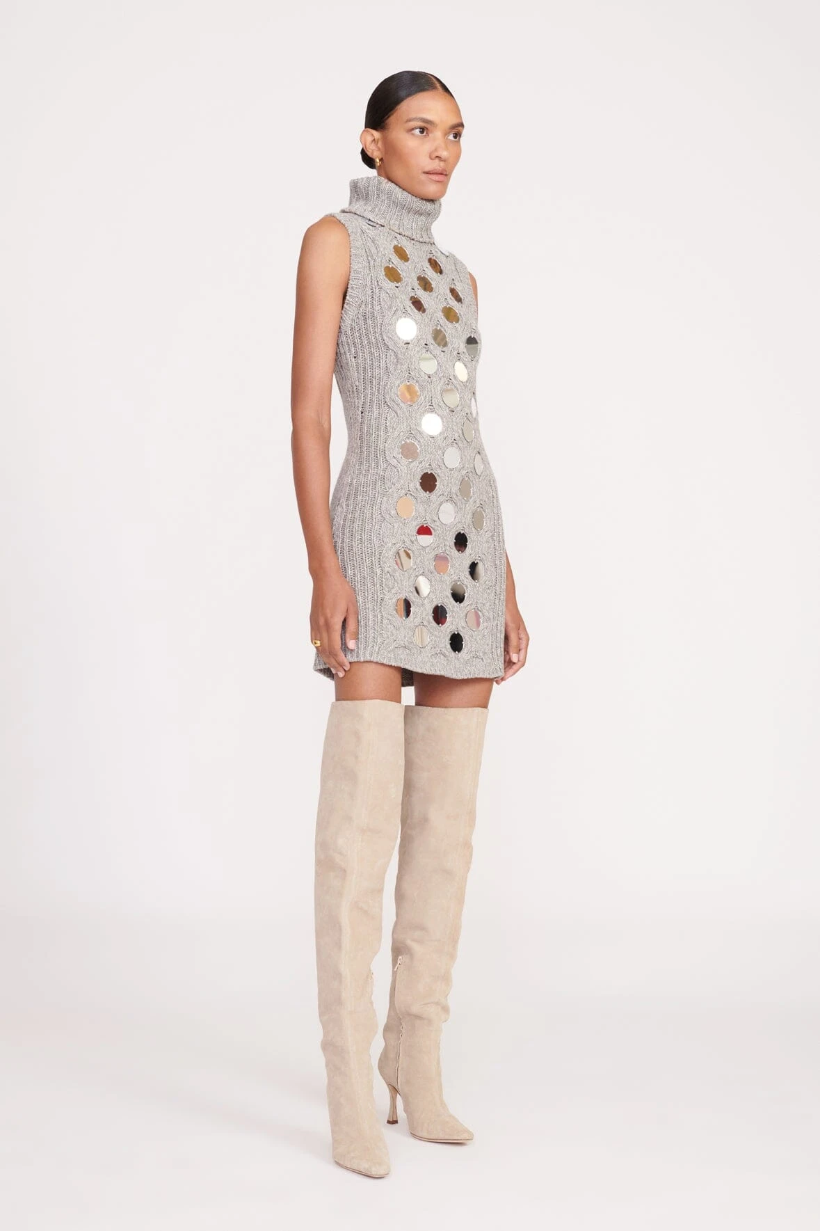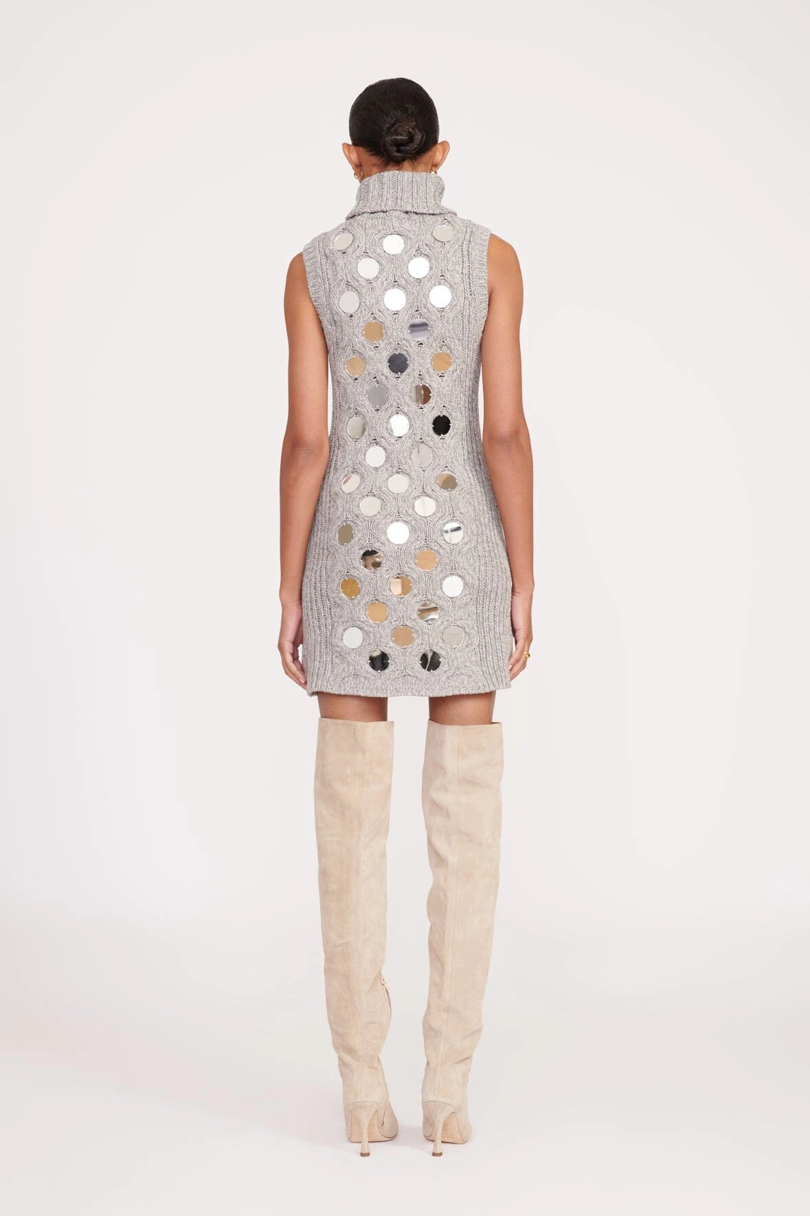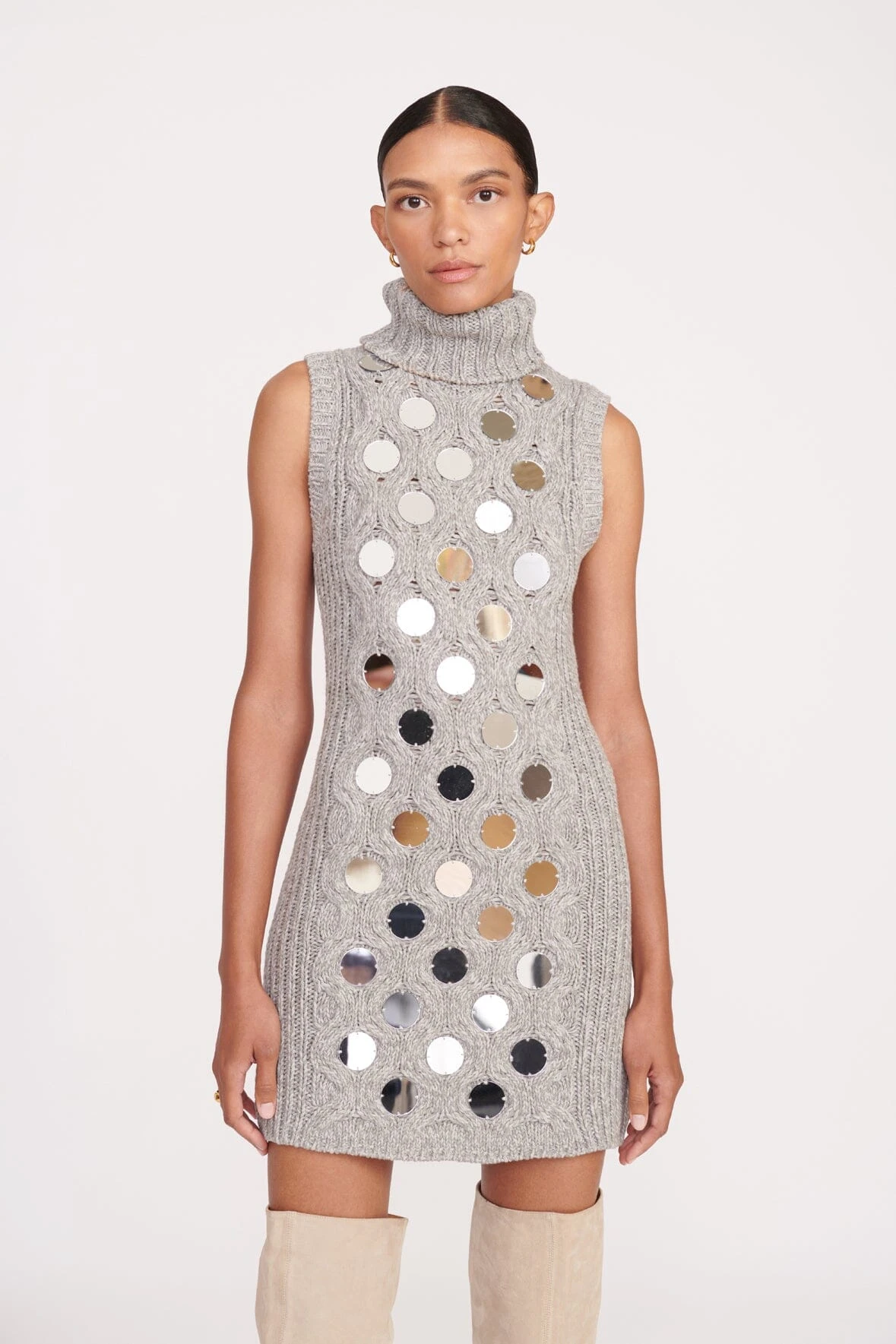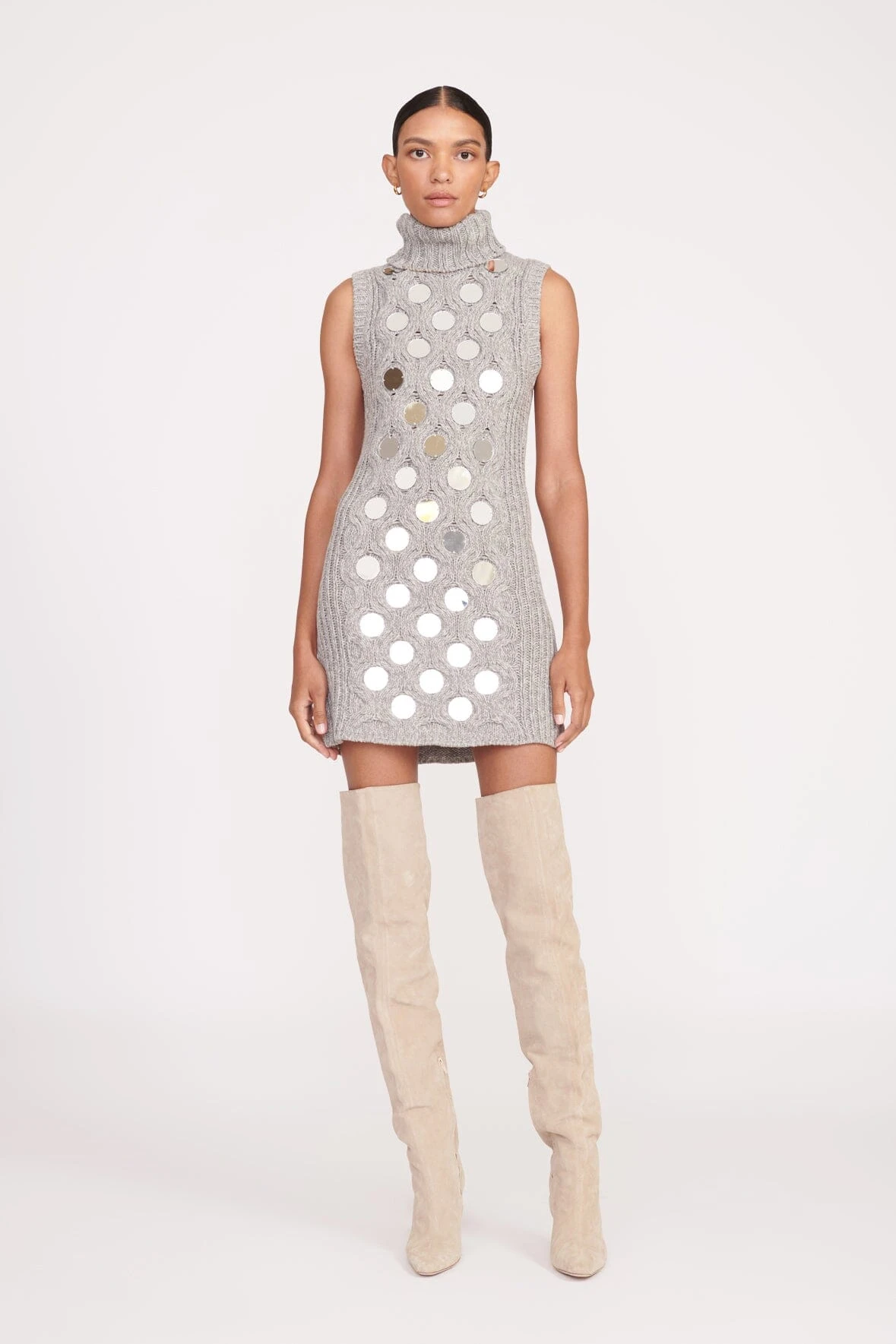 A mini sweater dress in a honeycomb cable knit with mirrored paillettes, the Mod Dress is the perfect dress to layer under a coat with knee-high boots. The Mod Dress features a turtleneck and a sleeveless body.Â