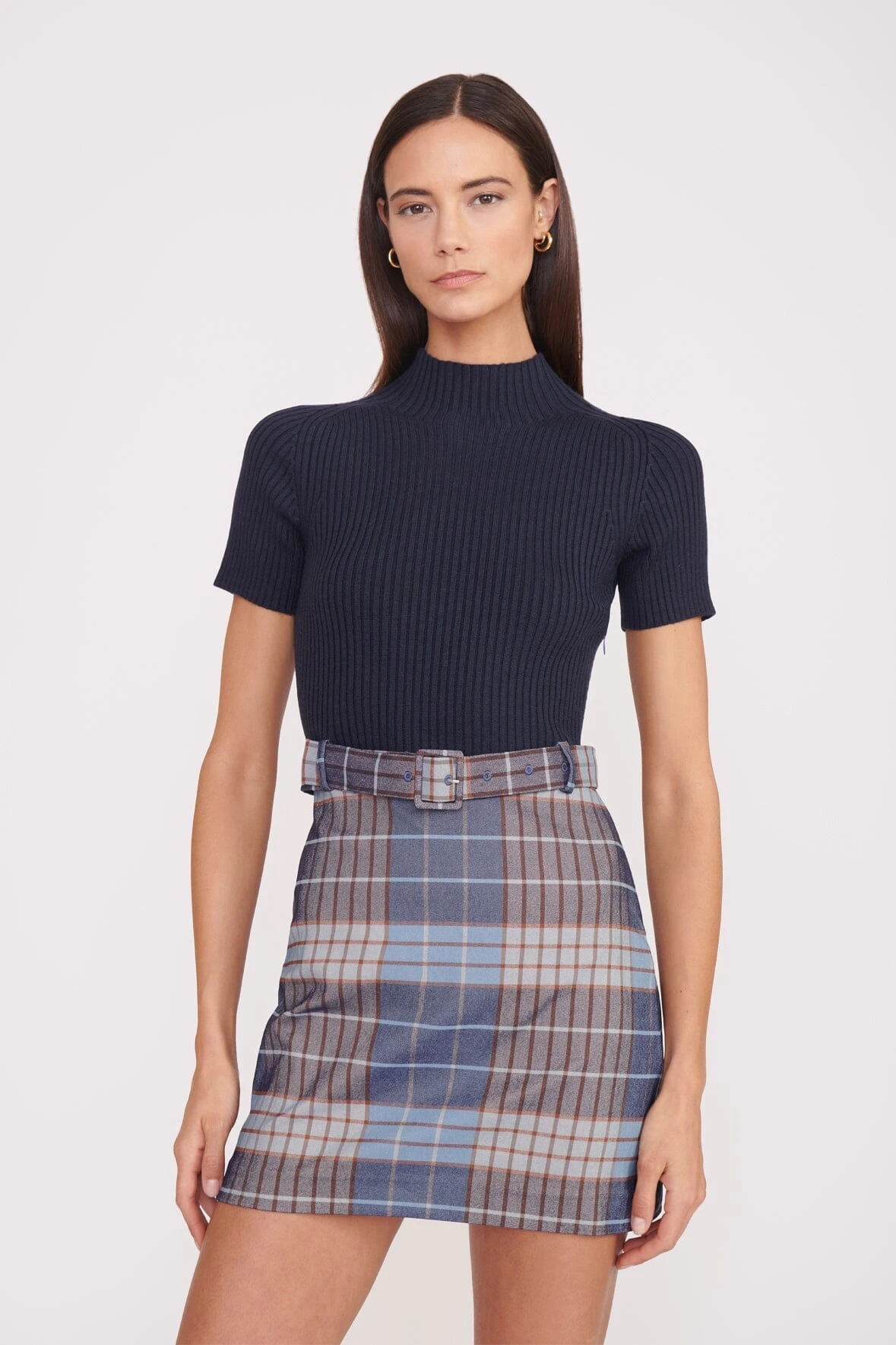 A short sleeved mini dress made from a knit and wool combo. The Patsy features a mock neck top and belted mini plaid skirt.