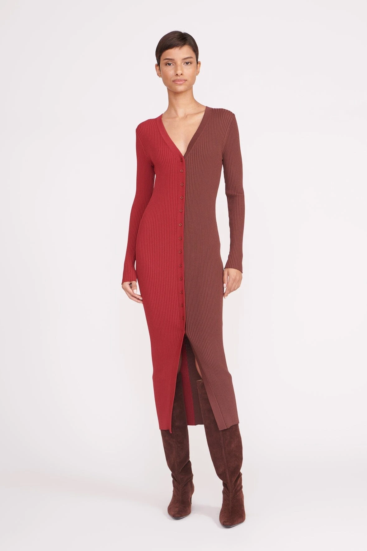 Our signature style, the Shoko Sweater, can be worn as a cardigan or dress. This multi-color style is made out of a stretchy, comfortable compact rib knit fabric