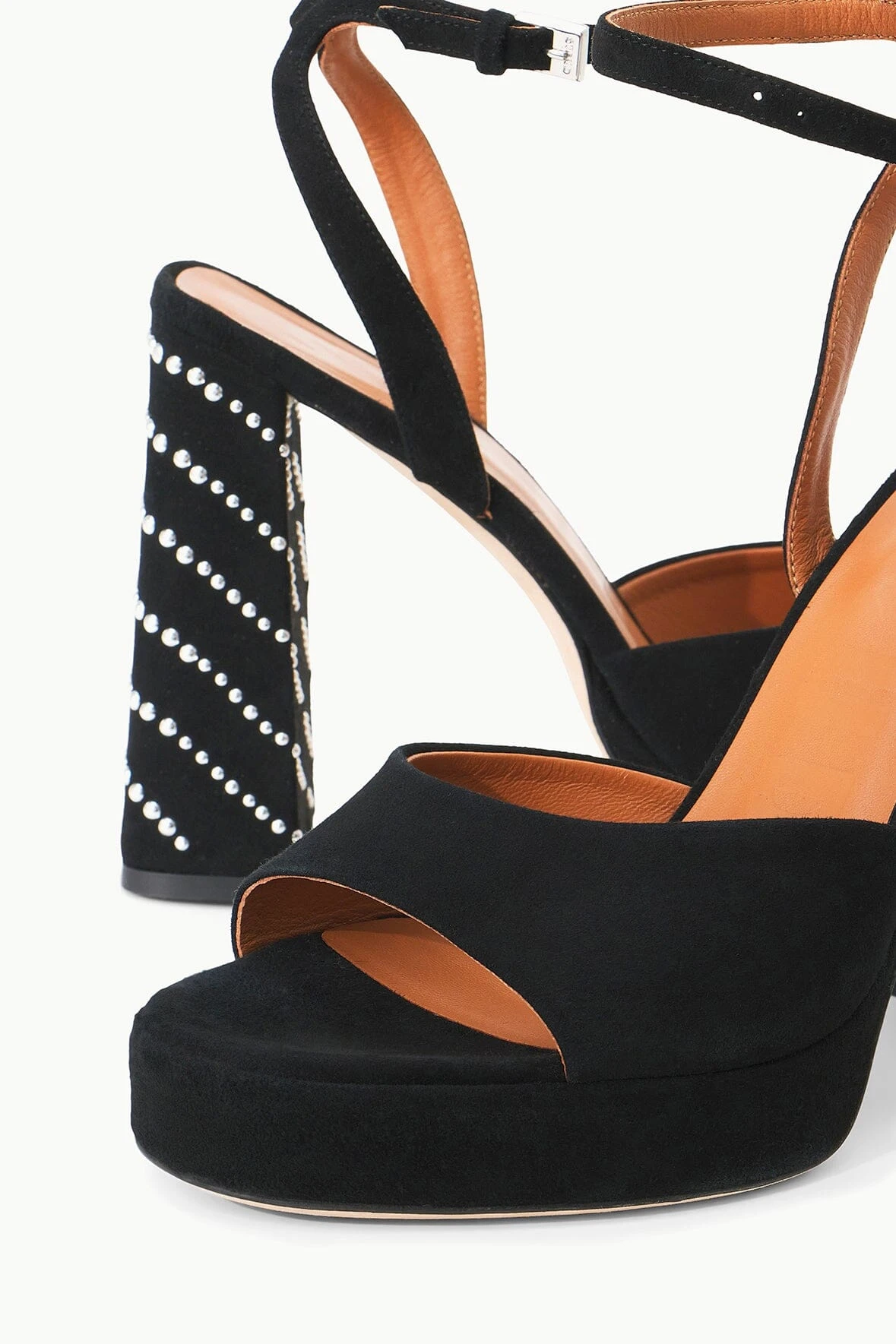 Updated for the season with a platform, the Solange is an open toe heel with ankle strap and buckle closure made out of suede with a metal stud embellished heel.Â