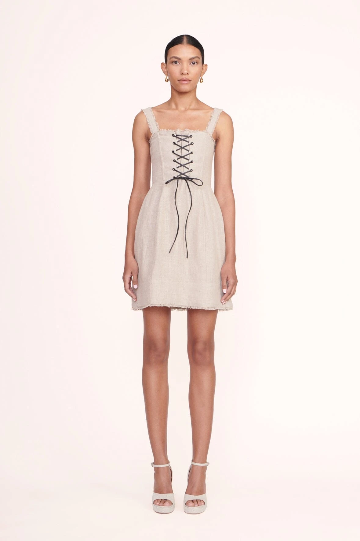 Updated for the season with a platform, the Solange is an open toe heel with ankle strap and buckle closure made out of linen.