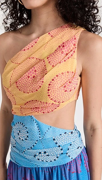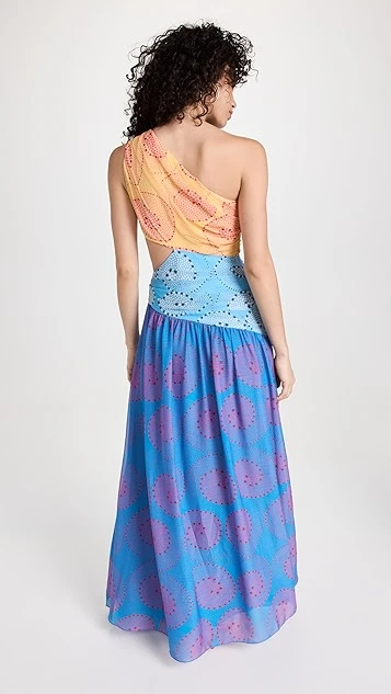Sophisticated and truly distinct, this STAUD maxi dress stands out with uniquely arranged colorblock panels and a spiraling abstract pattern. Go with simple footwear to keep the focus on this piece.