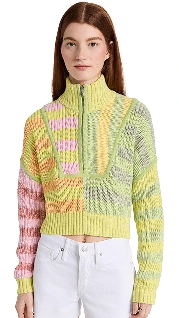 A charming piece of knitwear for transitional weather. This STAUD sweater cuts a unique silhouette, thanks to a slouchy drape, a half zip neckline, and an asymmetrical mix of light-colored stripes. Shorts and jeans will both work equally well with this piece.
