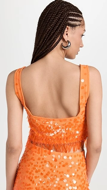 A smattering of sequins covers the entirety and hangs past the hem of this bright orange STAUD crop top. For a special-occasion look that’s sure to steal the show, add the label’s matching miniskirt to the mix.