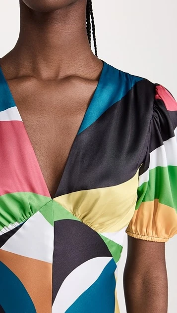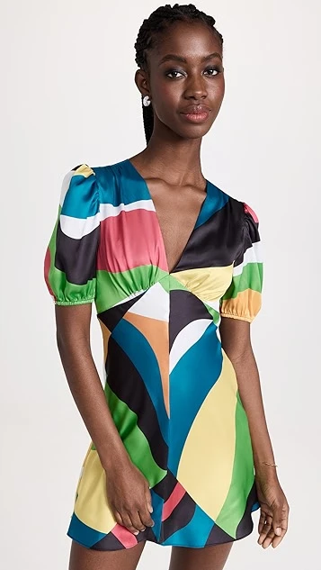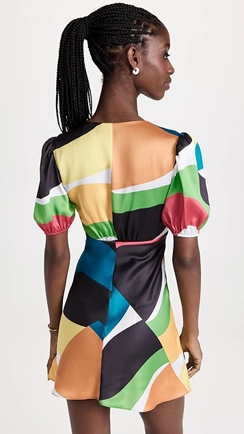 A silky STAUD mini dress that’s sure to draw the eye at your next occasion, detailed with an abstract print in a striking mix of colors. Diagonal seams emphasize the bodice, and puff sleeves provide a little extra volume.