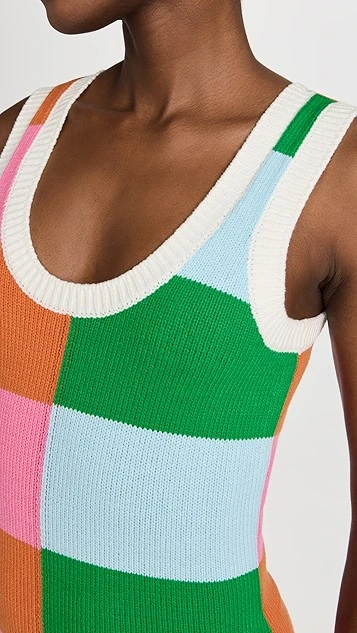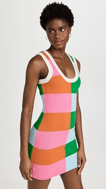 Featuring a bold, colorblocked mix of stripes, this figure-skimming STAUD mini dress won’t fail to draw the eye. Contrast trim outlines the sporty scoop neckline. This piece will work well with all sorts of footwear choices, from heeled sandals to everyday-friendly slides.