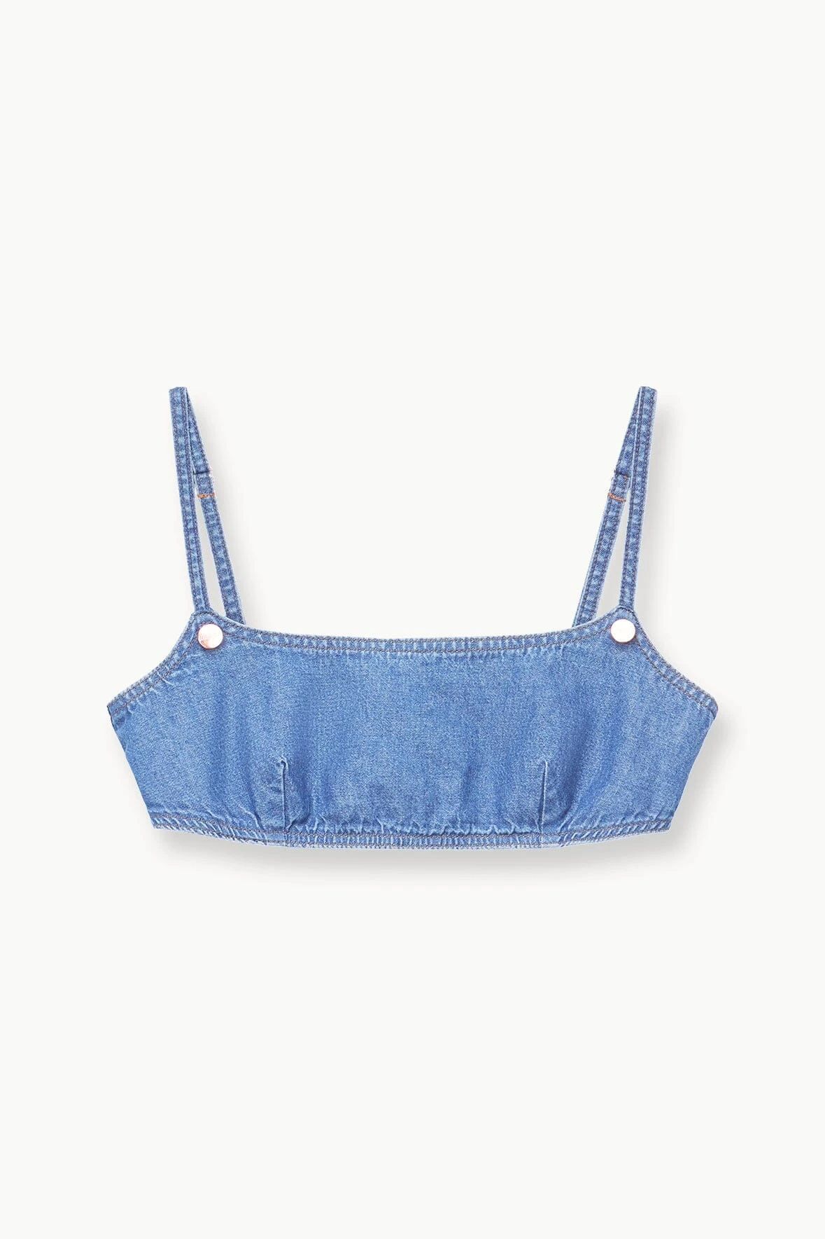 The Jean Bikini is a bra-style top, meant to be layered under your favorite top or jacket, or worn on its own. Crafted in a comfortable denim chambray, this style features darting at the bust and 2 rows of snaps at the back for adjustability.Â