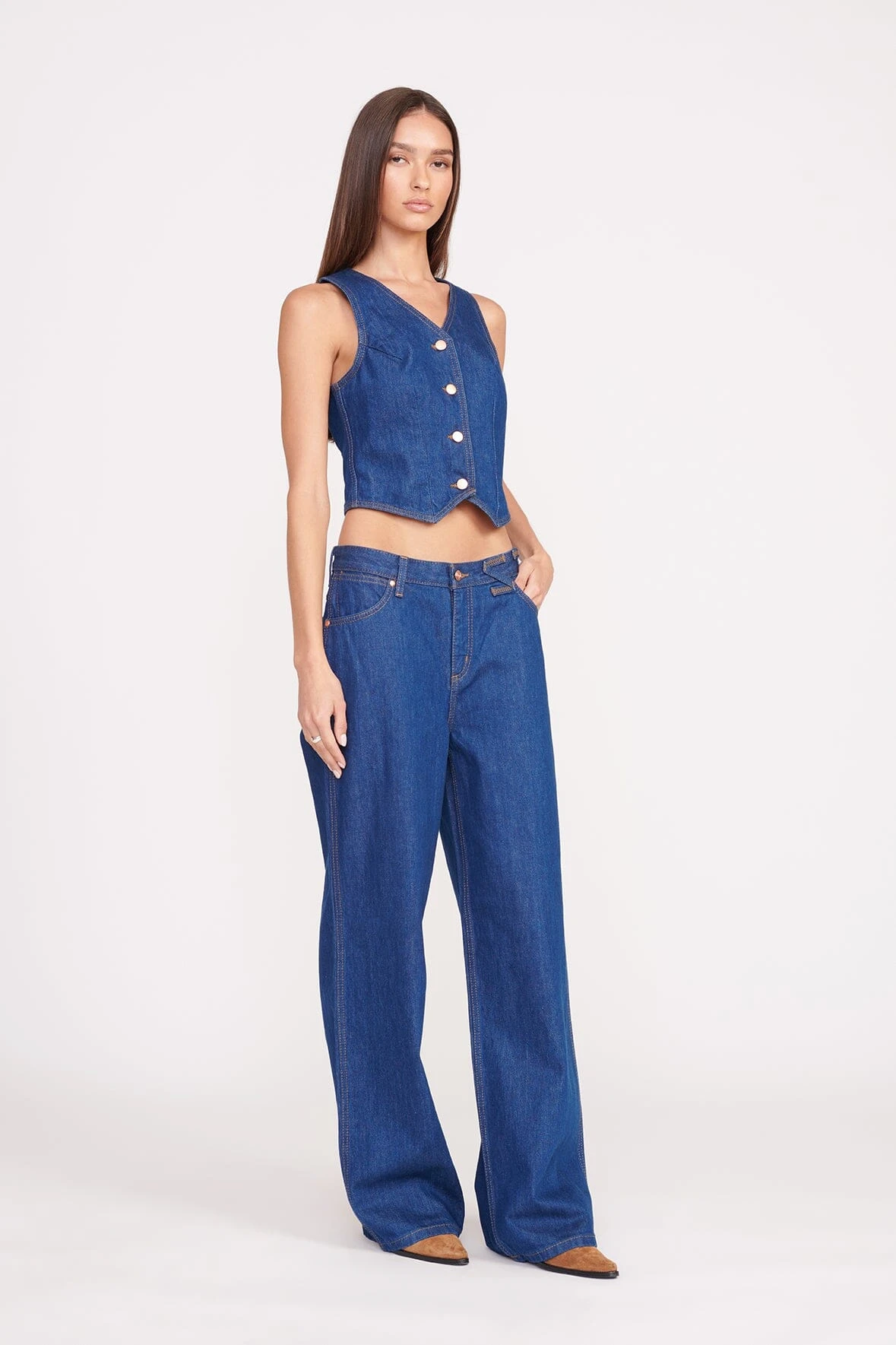 The Loose Jean is our ultra-relaxed fit. This low-rise jean sits below the natural waist and a wide leg. This style is available in 2 inseam lengths and features our STAUD belt loop detail at the waist. Size down to wear as a mid-rise fit.