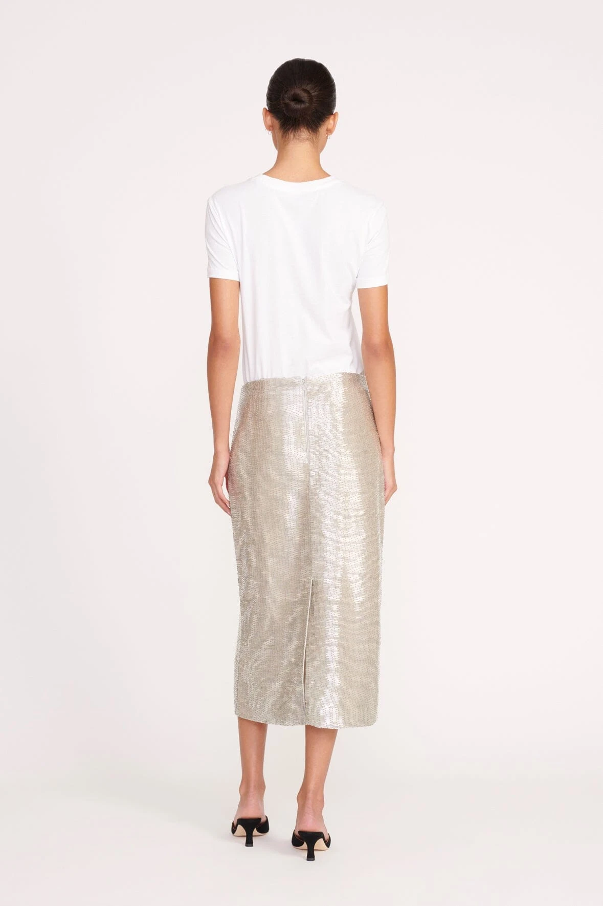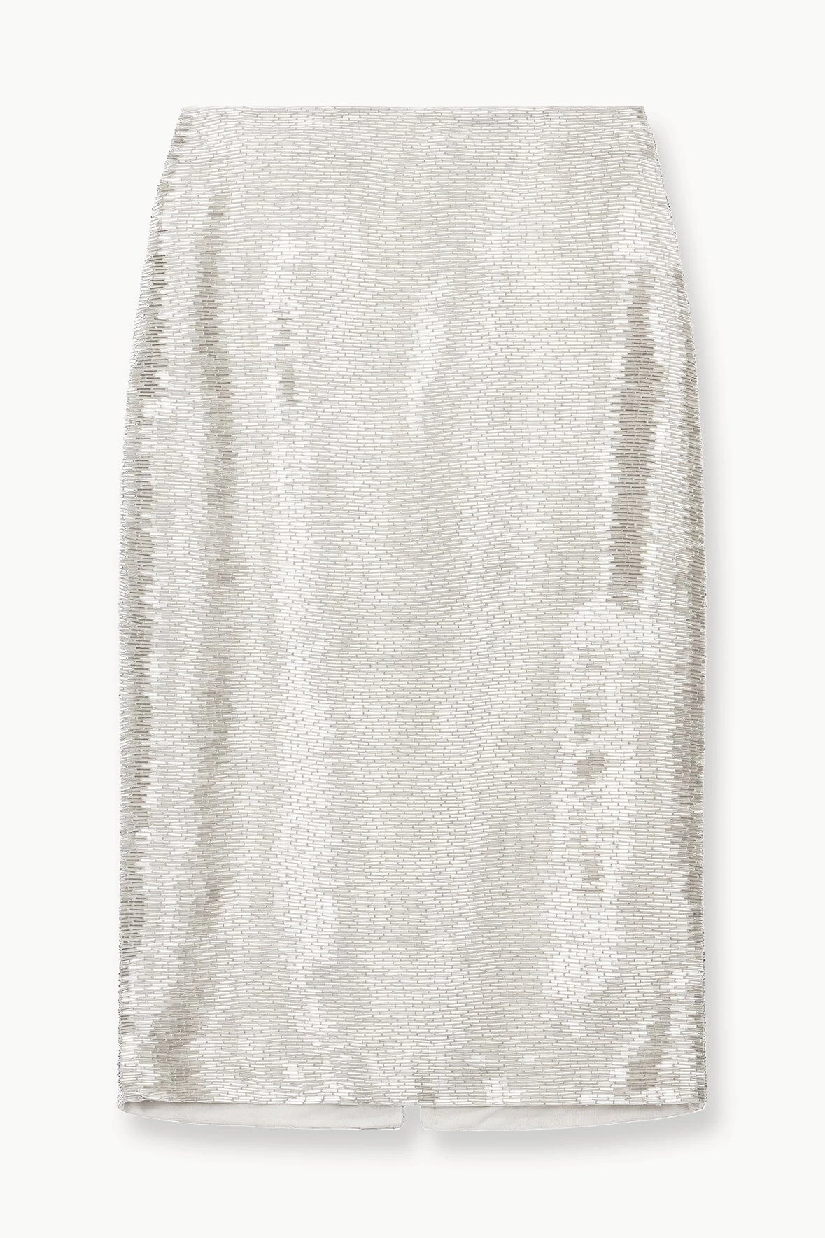 A straight fit, midi-length skirt fully embellished in metallic bugle beads.This style features a hidden zipper and is fully lined.